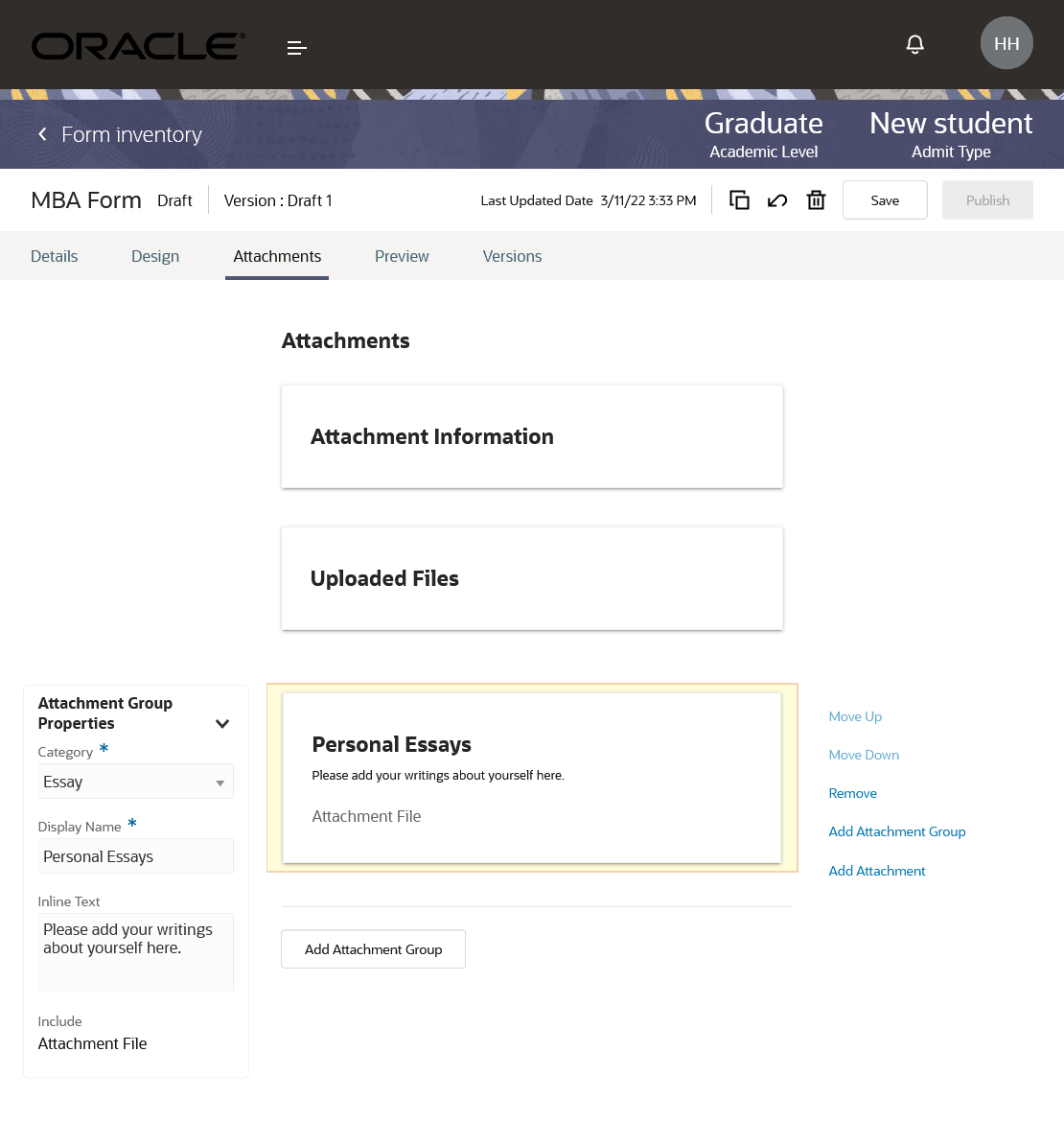 As an admissions manager, you can configure your application form attachments section by adding at least one Attachment Group and then defining the display name and category for that Attachment Group. This informs applicants about which attachments they should prepare for their application. Refer to the related release readiness feature: Attachments for Admissions Applications.