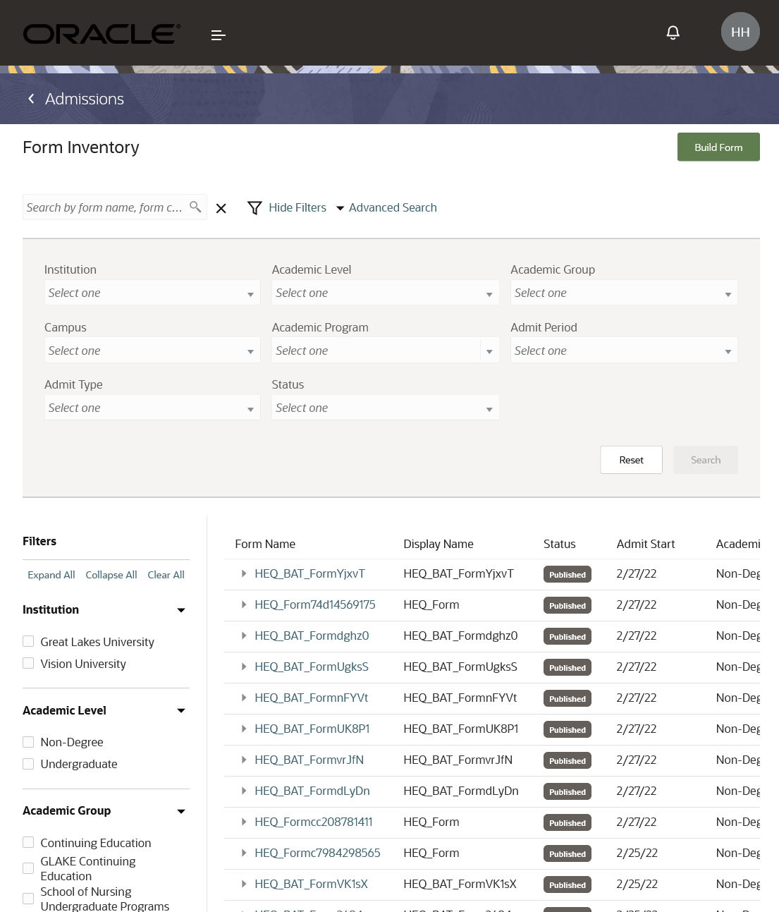 The Admissions landing page has an updated view with a new button for Form Inventory. The new Advanced Search capability inside the form inventory provides an easy way to find application forms. Then, click Show Filters and filter the search results further to drill down into specific application forms for admissions processing.