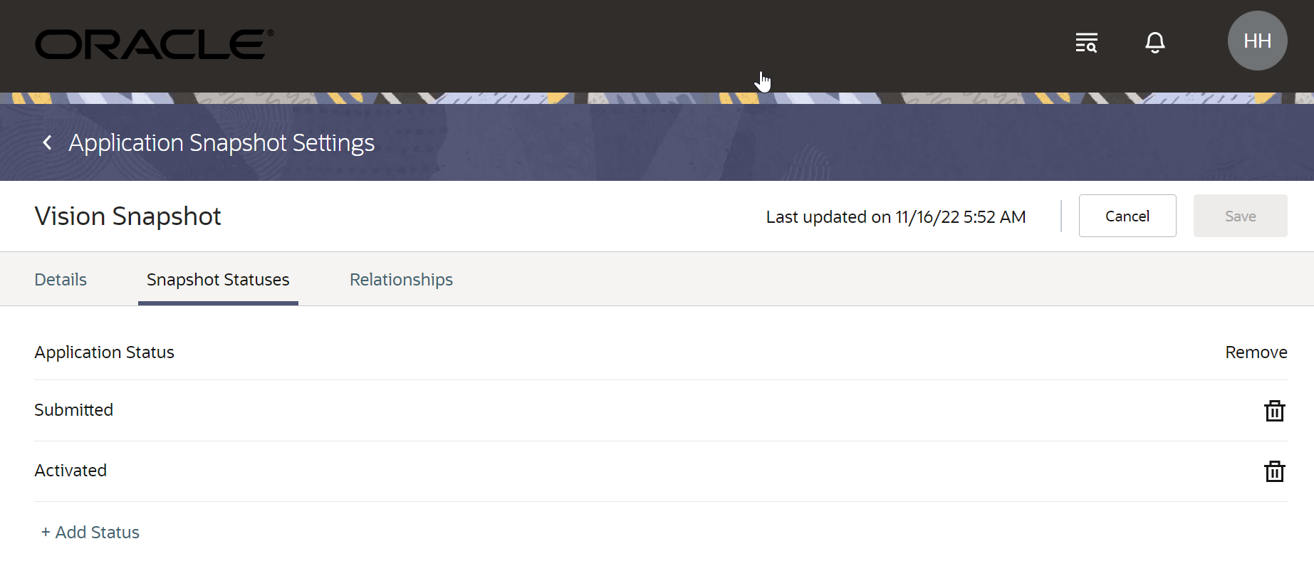 - On the Snapshot Statuses tab, select and add different application statuses for which you want to save an application snapshot.