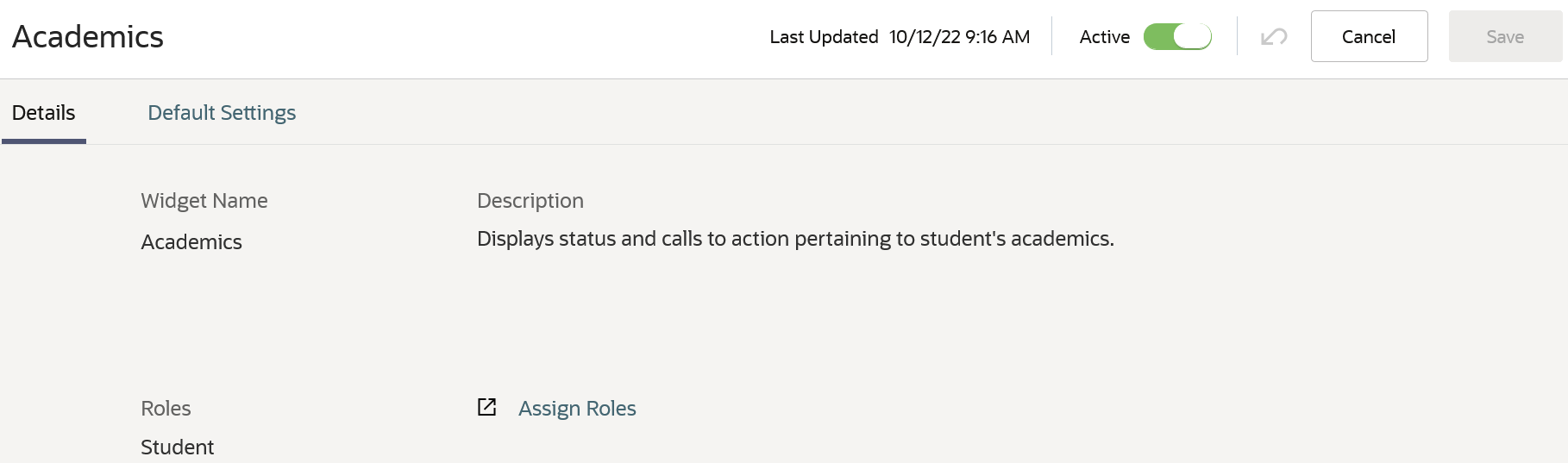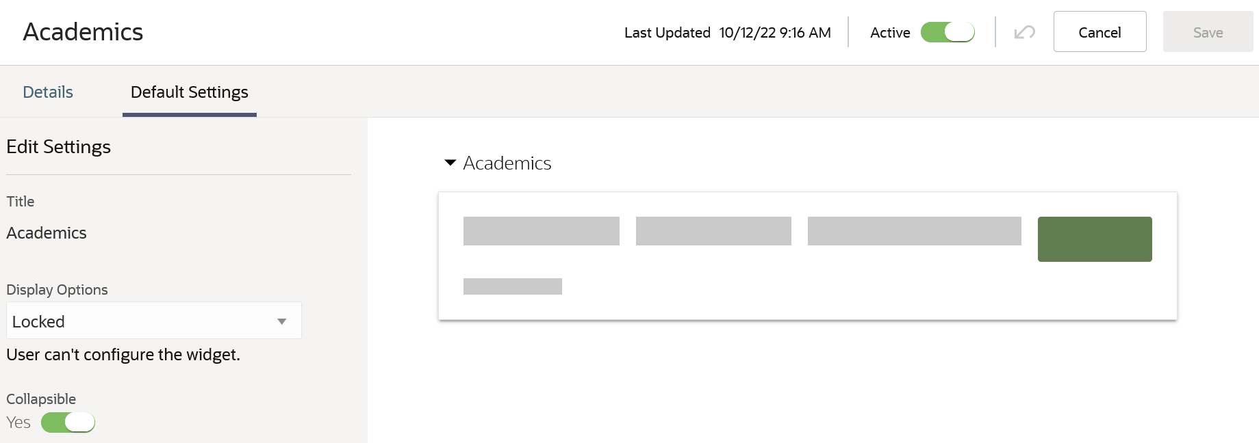 On the Student Central Configurations page, the higher education application administrator configures the Academics widget to appear on the Student Central landing page for students. To view the widget, a student must have an account and must be enrolled in a program or a course.