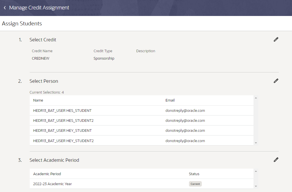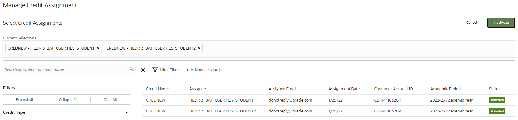 To perform the bulk assignment, use the Manage Credit Assignments page.