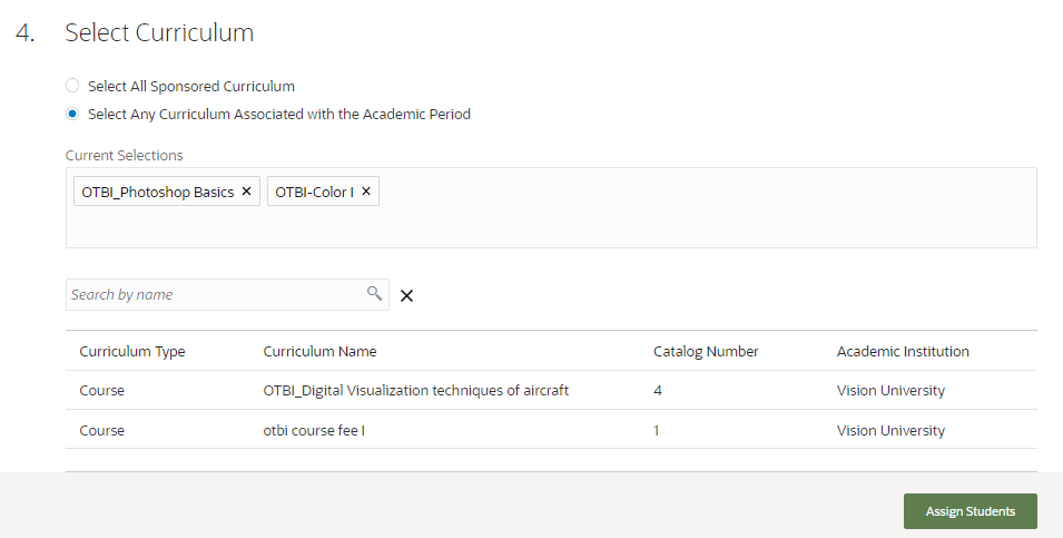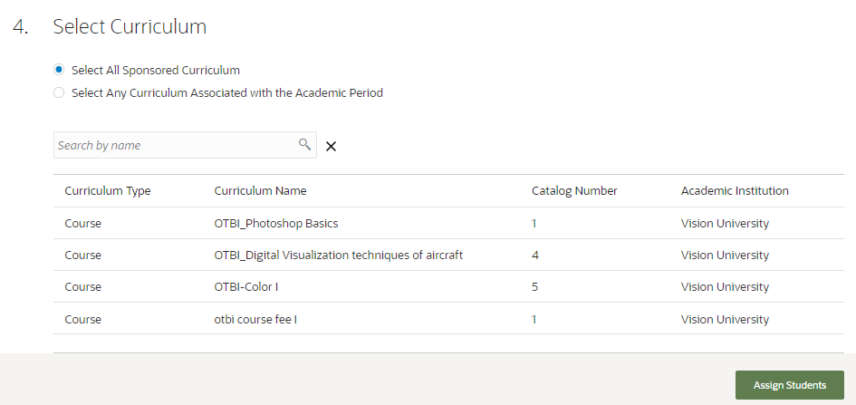 Select All Sponsored Curriculum. This option means that you're essentially sponsoring students for all the curriculum associated with the academic period. The process selects all the curriculum linked to the academic period for this specific student credit. And students can enroll in any of the listed curriculum.