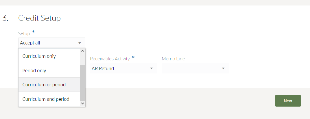 This feature is dependent on your academic structures and business unit setup as well as the transaction types you set up in Oracle Fusion Cloud Receivables.
