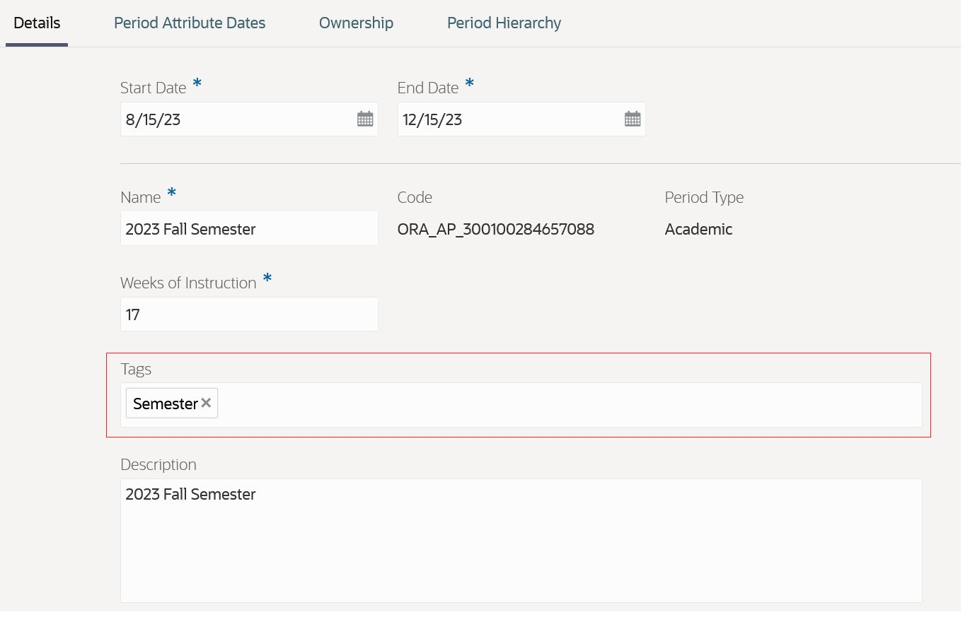 Assign tags to academic periods to differentiate different types of academic periods such as semesters and trimesters. The list of tags is based on the tags that are associated with the Academic Period tag group. You can add or remove tags from a tag group on the Manage Attribute Tags page.