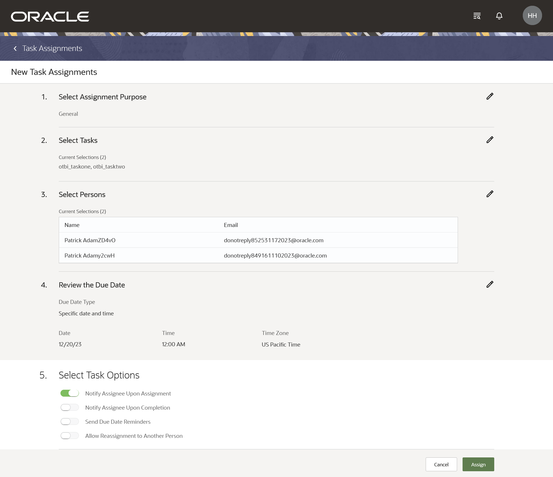 - You can view or edit the summaries of choices selected in each step of the task assignment wizard before triggering the assignment.
