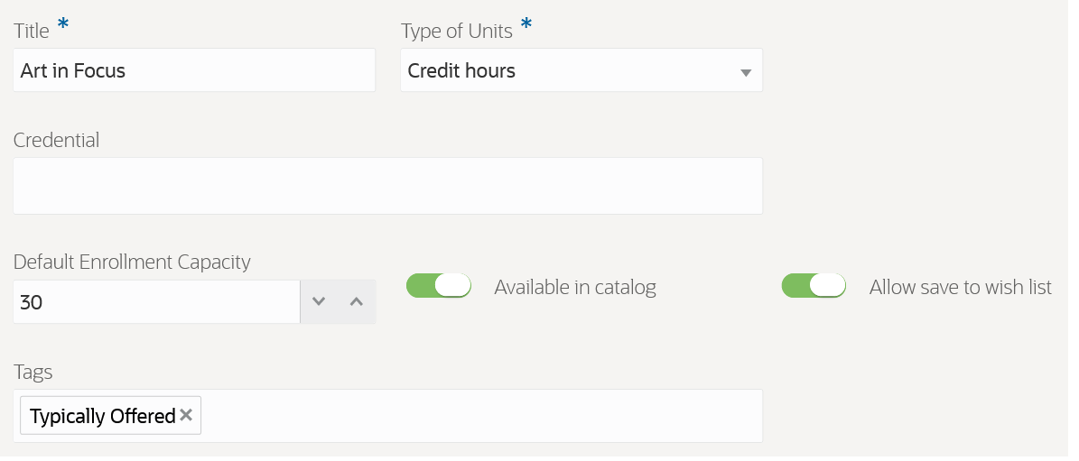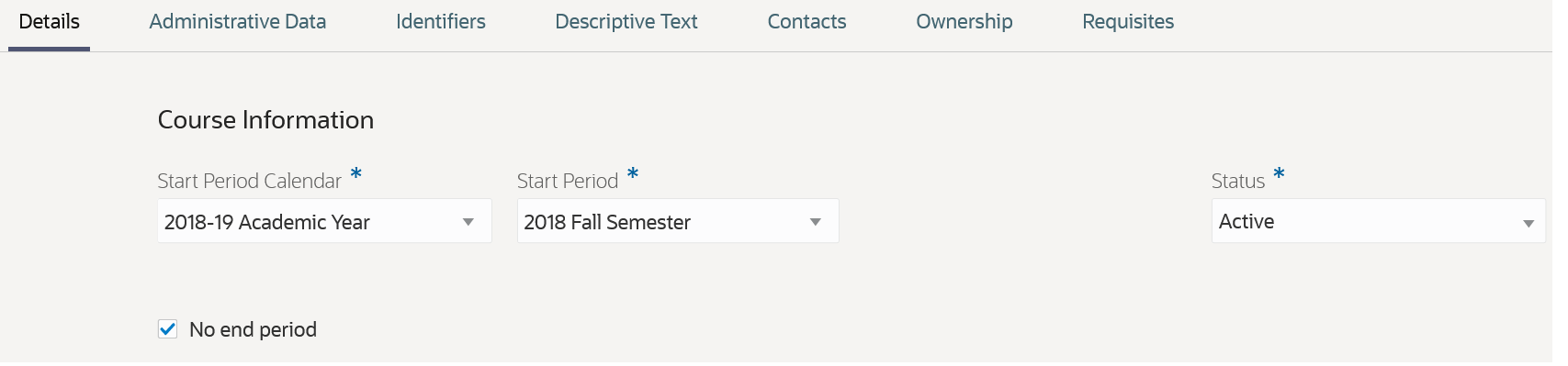 - You can now assign tags as part of the create course section process and edit tags on the Details tab (moved from the Administrative Data tab). Also on the Details tab, the Available in search field is now the Available in catalog field.
