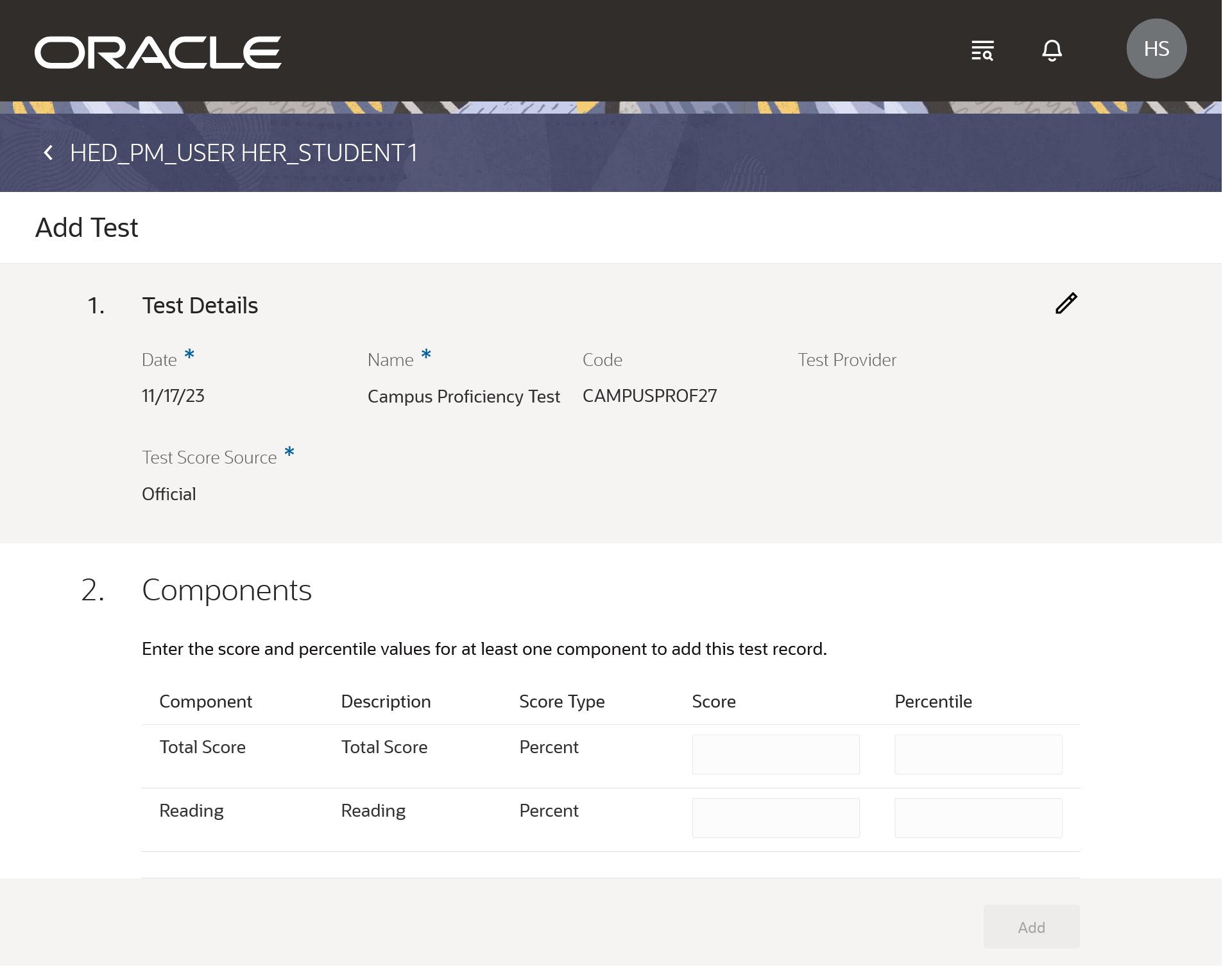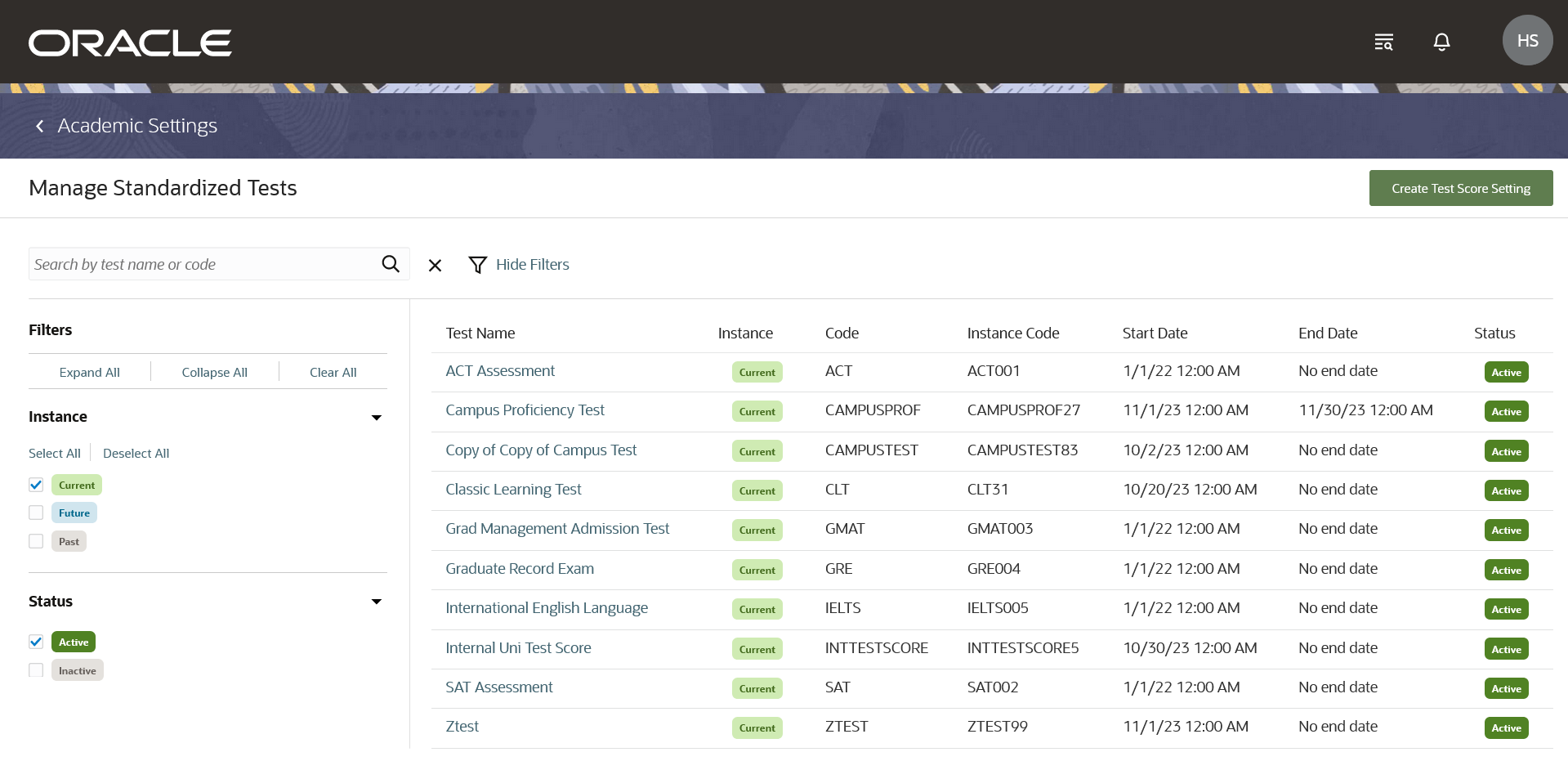 Oracle Fusion Student Management Cloud now allows you to record test results to maintain an applicant’s or students’ academic history. These test results can be used for admissions evaluations, for course equivalency processing, or for language proficiency requirements.