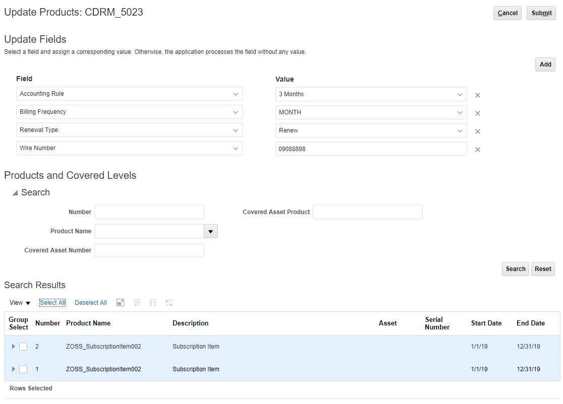 Update one or more fields for multiple subscription product lines and covered assets within a subscription at once. Renewal reps can select the rows to update and edit updatable fields for subscription products and covered assets in real time.