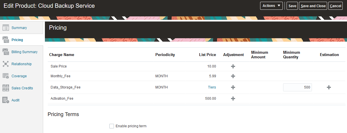 You set up minimum thresholds and estimates for the subscription product from the Pricing tab.
