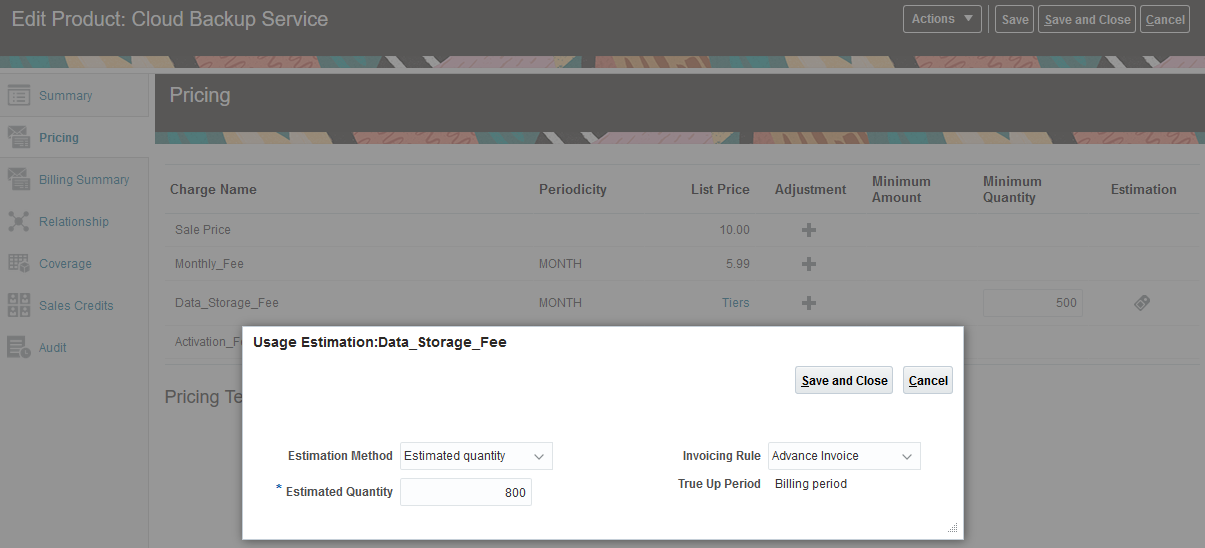 From the Estimation column, open the Usage Estimation window to estimate usage. You can base your estimate on a specified quantity or amount per billing period.