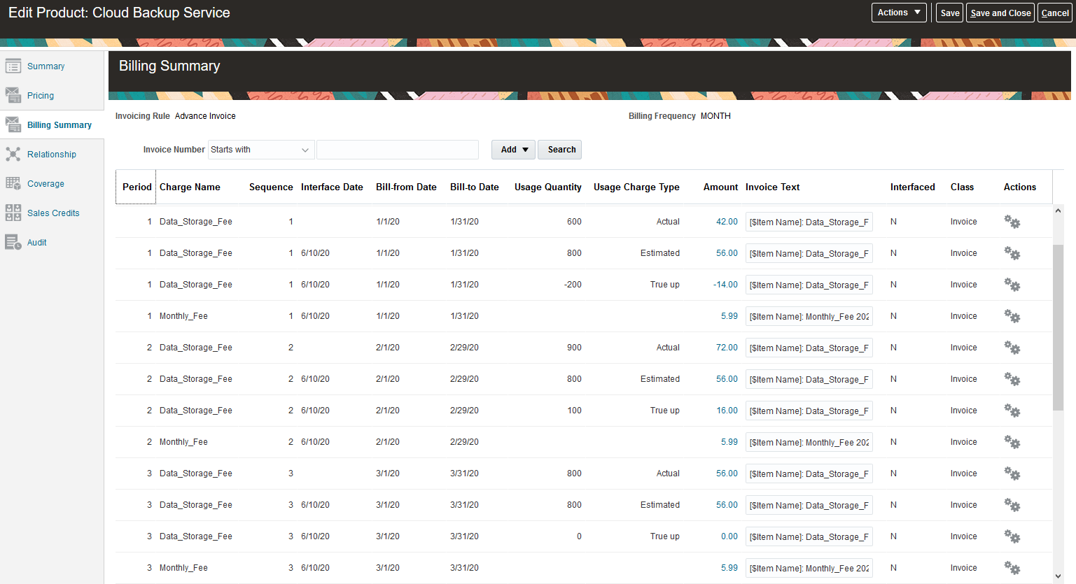 The estimates are used for the billing process, but once the actual usage is obtained, you can run the True Up Usage Bill Lines scheduled process to adjust or true up the billed amount. This process compares the billed estimate against the actual usage. If your customer hasn't consumed the minimum amount or quantity, they are charged for that minimum value instead of the actual usage. The process checks all usage lines previously rated and billed and adjusts for the difference in the next billing period.