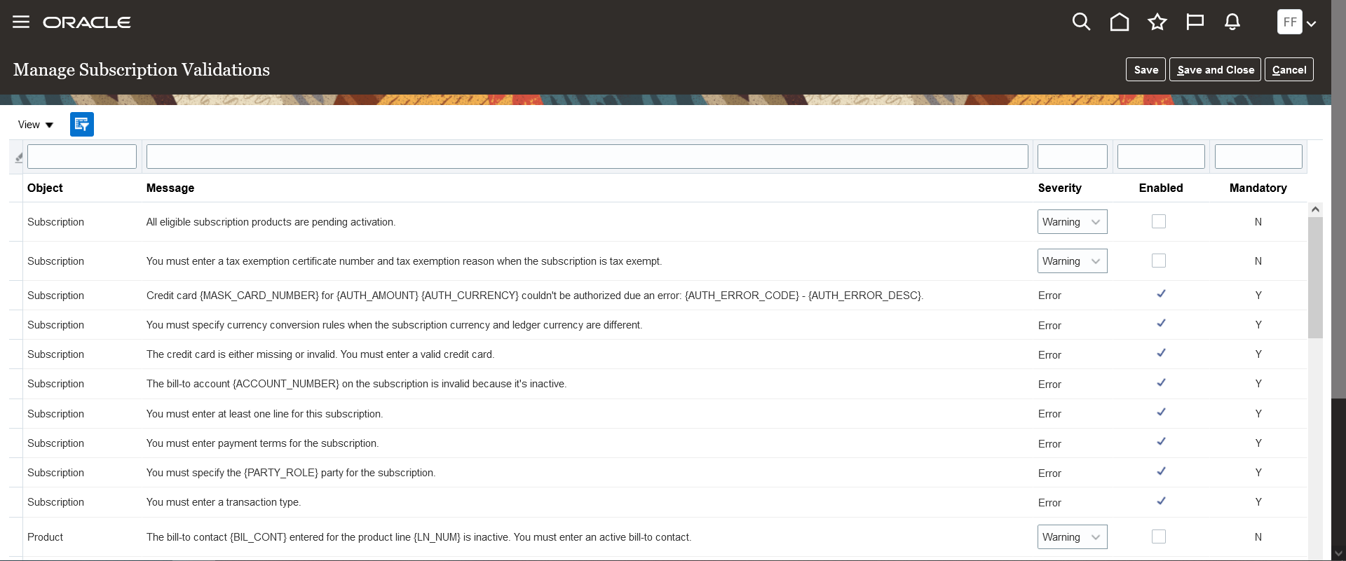 You can enable or disable the subscription, product, and covered level validations and change their severity using the Manage Subscription Validations page: