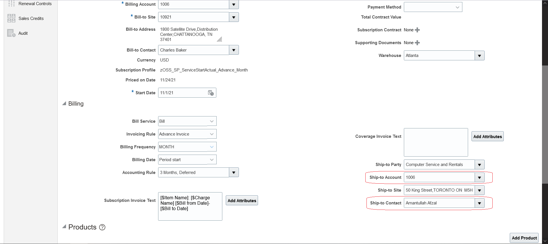 Bill-to Contact, Ship-to Account, Ship-to Contact and Warehouse: