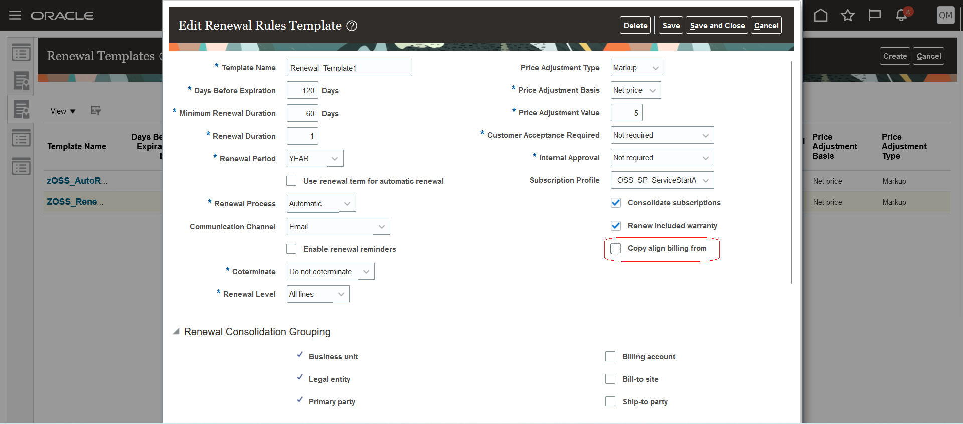 The 'Copy align billing from' checkbox is unchecked by default for the existing renewal rules templates. When the 'Copy align billing from' checkbox is checked, the renewed subscriptions will have the 'Align Billing From' date copied over automatically from the source subscriptions.
