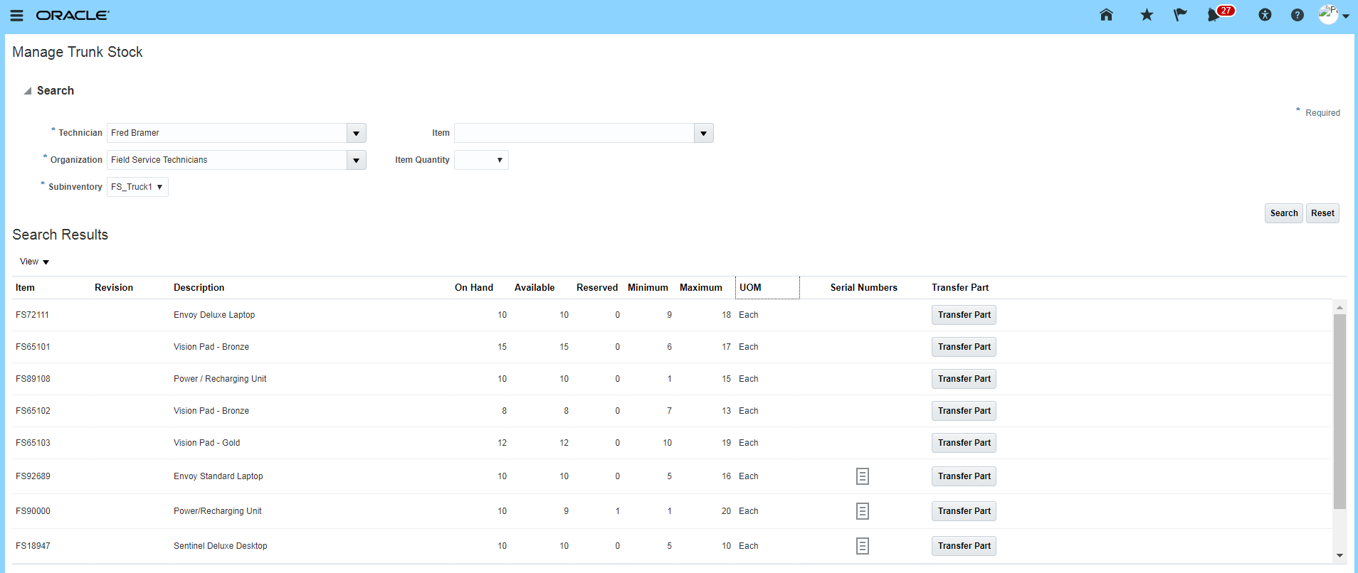 The Manage Trunk Stock UI provides comprehensive information on parts availability and recommended stocking levels in field technician inventory locations. Administrators can view item details in both usable and defective stock locations assigned to a technician. Administrators can also search for excess or shortage quantity items than the recommended levels. Stocking locations are assigned to technicians using the Technician Setup UI which is described later in this document.