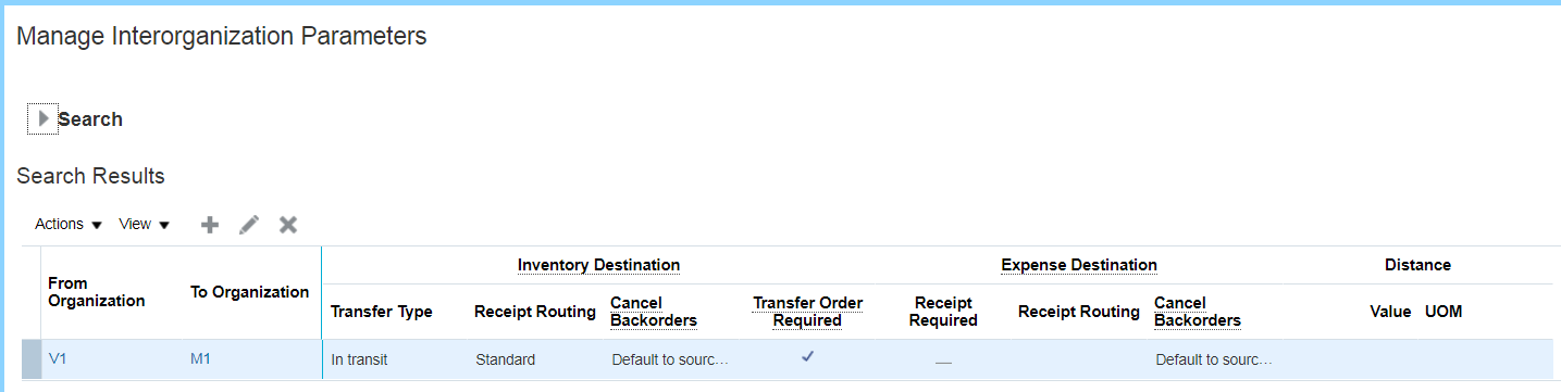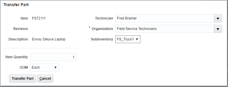 - When sourcing and ordering parts for field technicians, the transfer order requires that the source and destination are internal locations associated to inventory organizations (warehouses).
