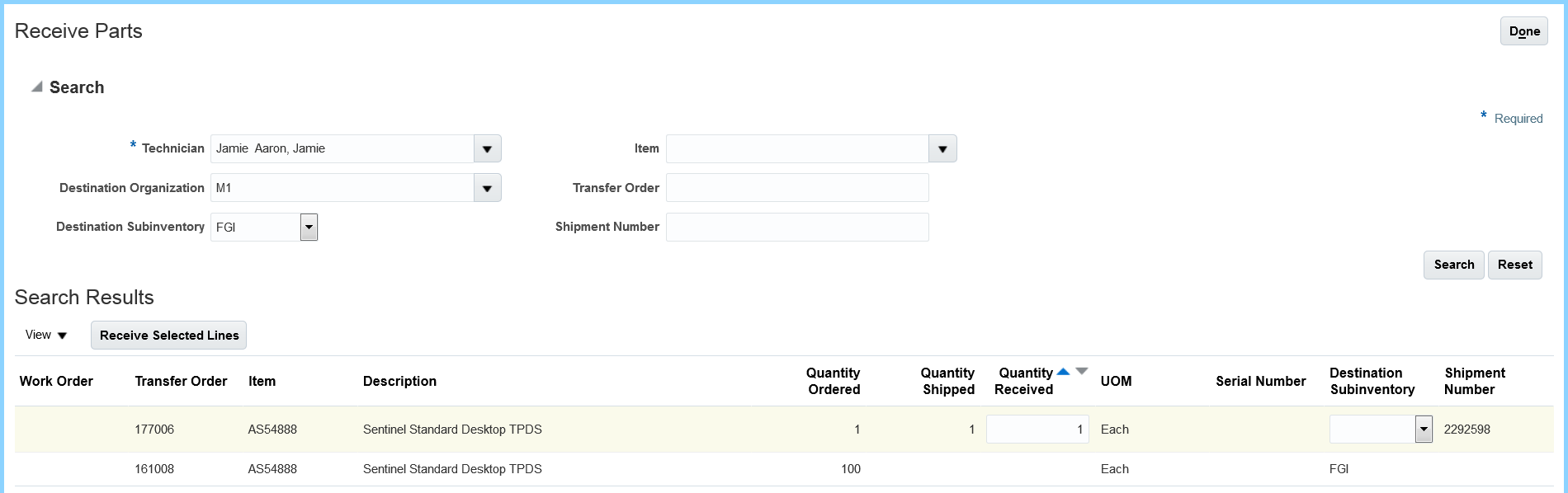 Administrators can either select a single receipt line or multiple lines to receive parts into the destination subinventory. Administrators can choose the subinventory into which the item is received. This Receive Parts user interface also supports receiving predefined serial controlled items