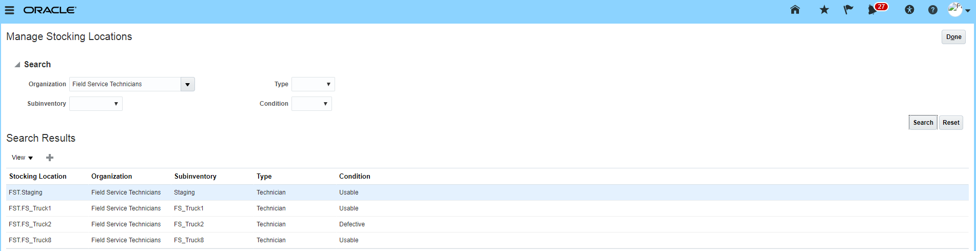 The Manage Stocking Locations UI is used to select and setup the stocking locations that will be used in Service Logistics. Stocking locations can be tagged as Usable or Defective which allows them to be assigned to field techs in the Technician Setup UI.