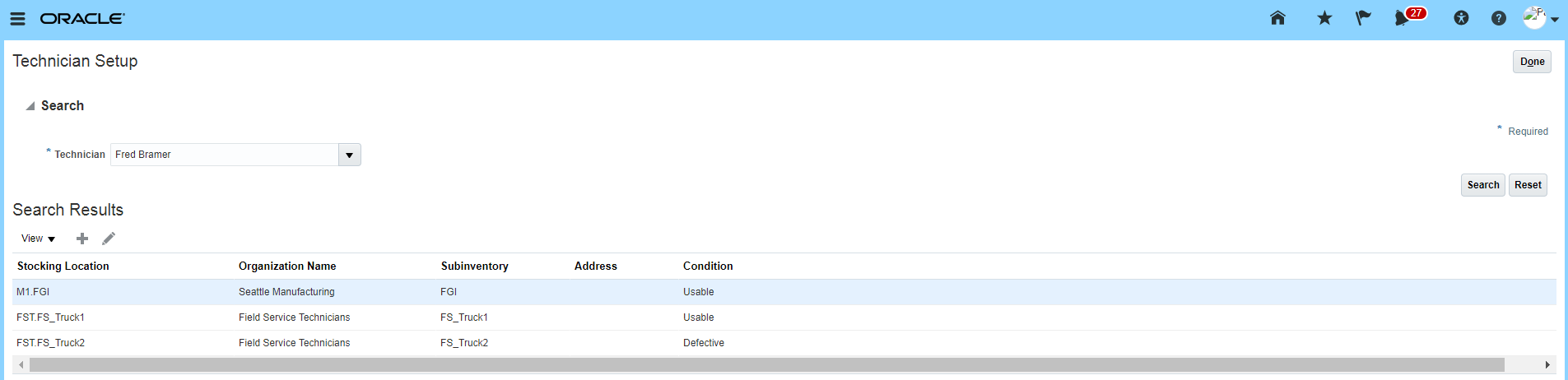 Using the Technician Setup UI, you can assign the stocking locations setup in the Manage Stocking Locations UI to individual technicians (can be shared). Technicians can then receive, transfer and debrief parts from these stocking locations. You can assign multiple stocking locations to each technician. However, technicians can have only one usable and one defective default stocking locations.