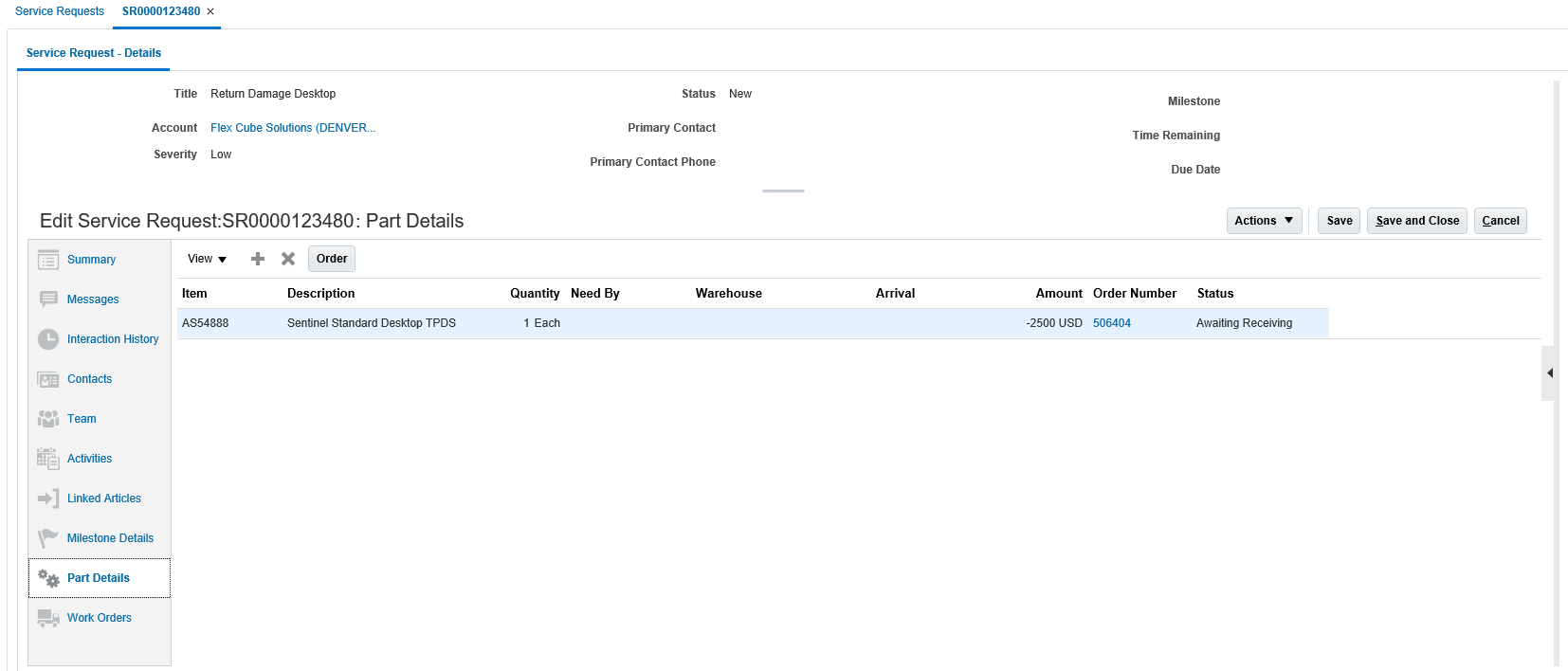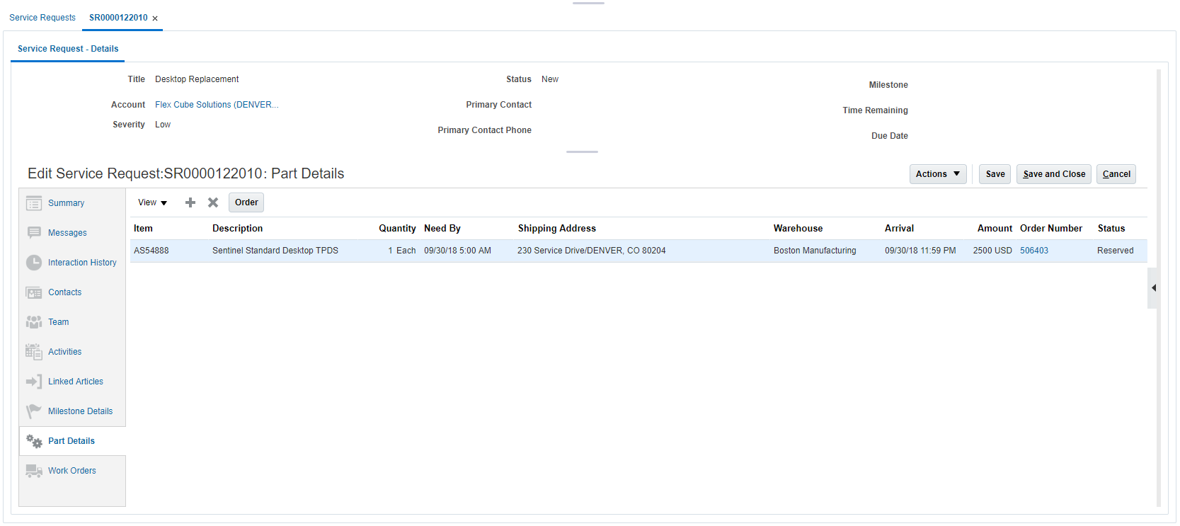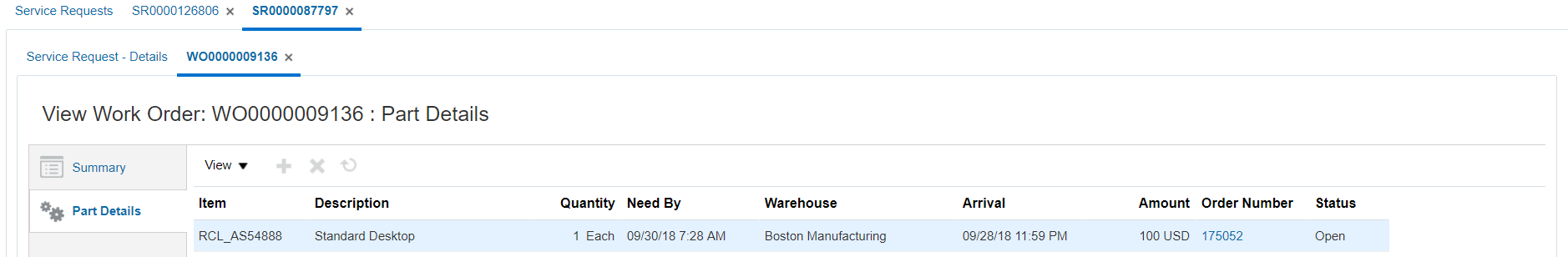 The parts required to fix the customer issue are captured within the Part Details tab of Service Request user interface displayed below.