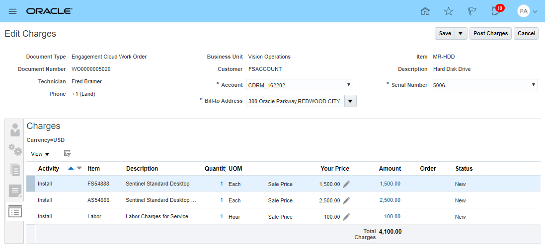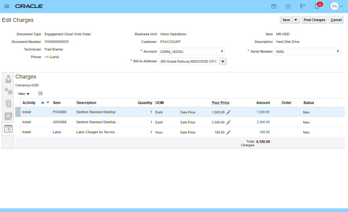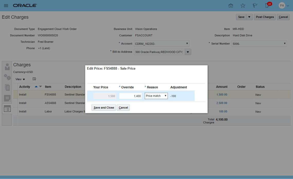 The Edit Charges UI allows Field Service Administrators (FS Admins) to review part, labor, and expense debrief transactions that are recorded by Field Service Technicians. The price of the parts used and labor hours spent are derived from a price list setup in Oracle Pricing Cloud. In case there is discrepancy between the price that the customer was promised and the price setup in Oracle Pricing Cloud, Field Service Administrators can adjust the price to match the promised price. This ensures that when these debrief transactions are posted, accurate amounts show up in the customer's invoice.