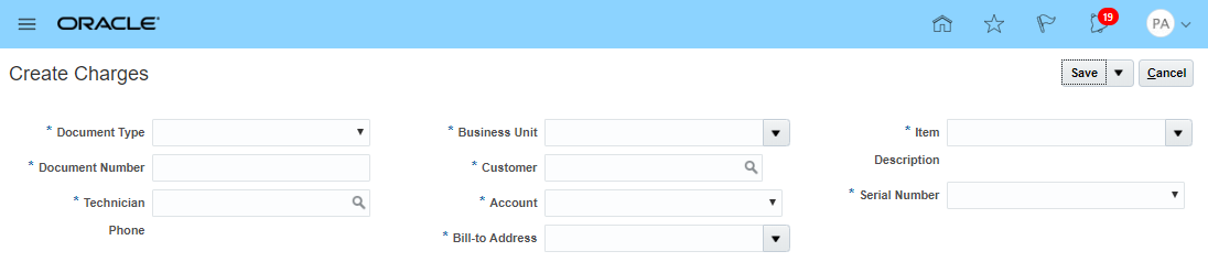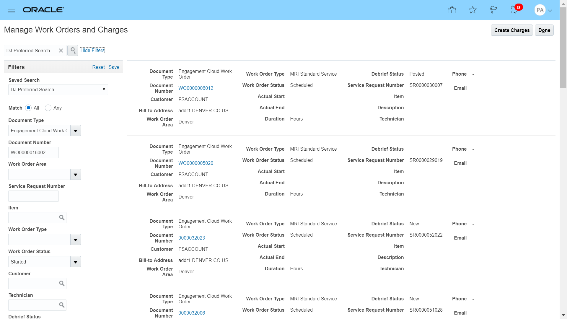 The Create Charges page supports creating debrief transactions for third party work orders or for Engagement Cloud work orders that have been debriefed using third party field service solutions. FS Admins can access the Create Charges page in two ways: