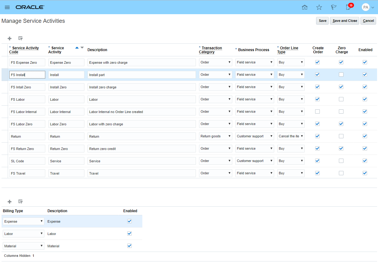 NOTE: Service activities filter the list of items when creating part, labor, and expense debrief transactions via the Billing Types associated to the Service Activity
