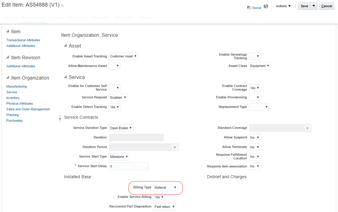 Serviceable parts, expense, and labor are set up as items in the Item Master. All serviceable parts and consumables that technicians use to fix defective asset must be set up in the Item Master and associated with a Material Billing Type. Labor and expense items must also be set up in the Item Mater and associated with Labor and Expense Billing Types, respectively.