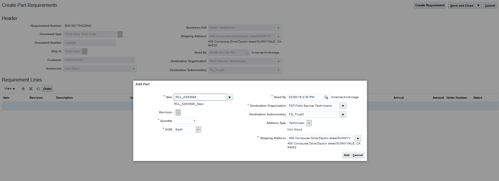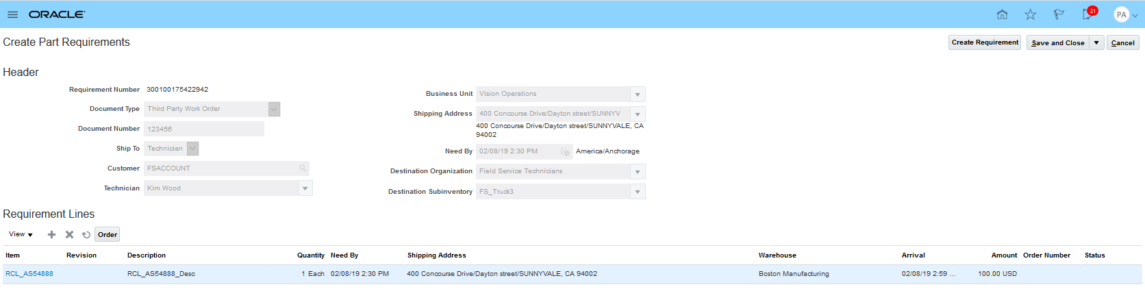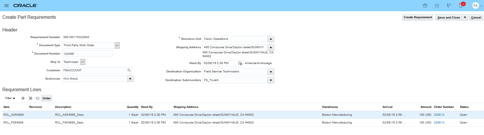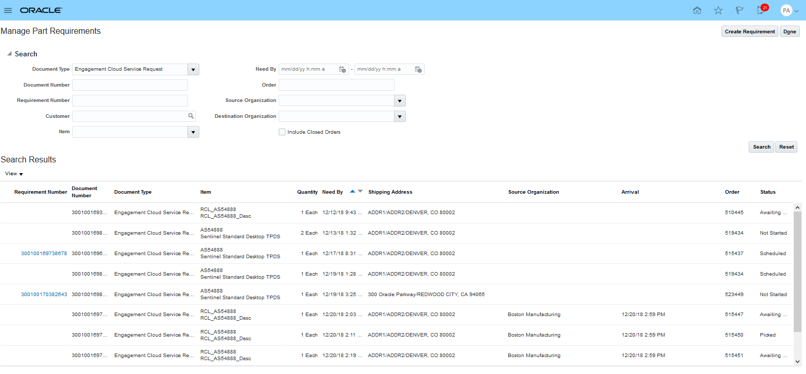 The Manage Parts Requirements UI enables you to create part requirements and then source and order them for Engagement Cloud service requests and work orders in the same way that you can directly perform these actions in the Engagement Cloud. The Manage Parts Requirements page also enables you to create part requirements and orders for non-Engagement Cloud objects, such as a service request from a legacy customer service application.