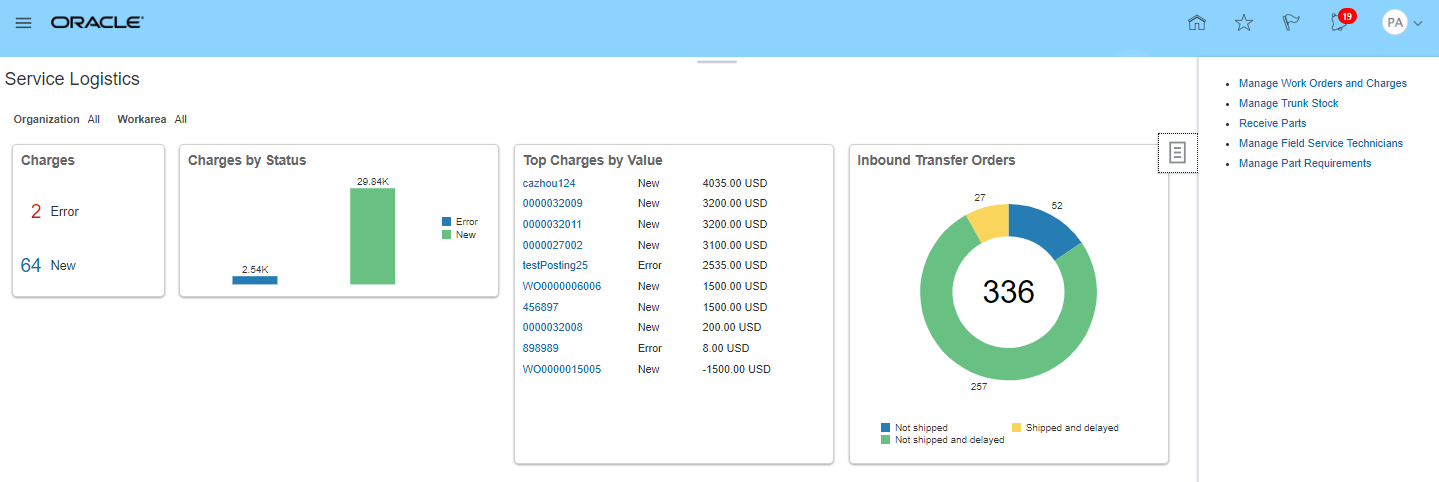 - The main region of the page displays actionable insights about charges and parts logistics, such as the number of new charges, the number of charges with errors, charges by top value, and the breakdown of transfer orders by different statuses. This information highlights to FS Admins the areas to focus on to ensure on-time delivery of parts to FS technicians and on-time accurate billing to customers.