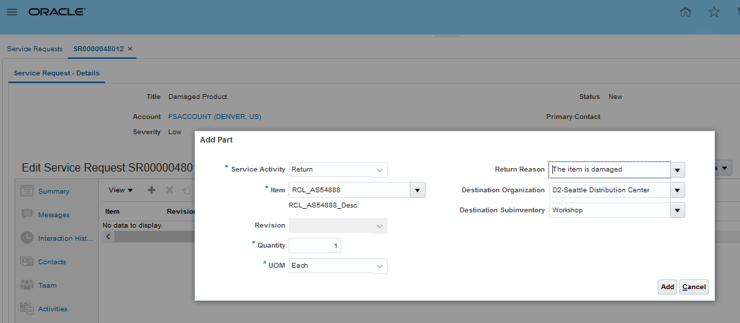 - In the Service Request Add Part UI, agent enters the part or product the customer is returning
