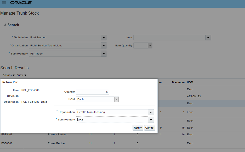 - When you click the Return button, a direct transfer transaction is created to move the parts from the field inventory location to the destination warehouse