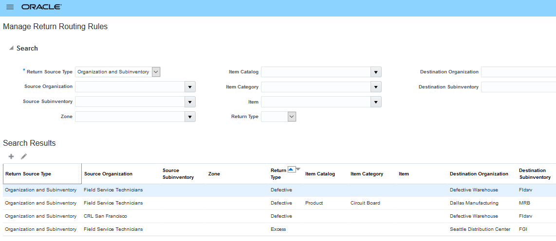 Return Routing automates the routing of parts and products being returned from customers, field service technicians, and field parts stockrooms. Service Logistics implementers can set up Return Routing Rules to define the warehouse to which the parts and products should be shipped. These rules can be defined by zone, stocking location (inventory organization and subinventory), item category, and item number. Automated return routing has been added to the Add Part UI in the Engagement Cloud Service Request Parts tab and to the Service Logistics Trunk Stock Management UI.