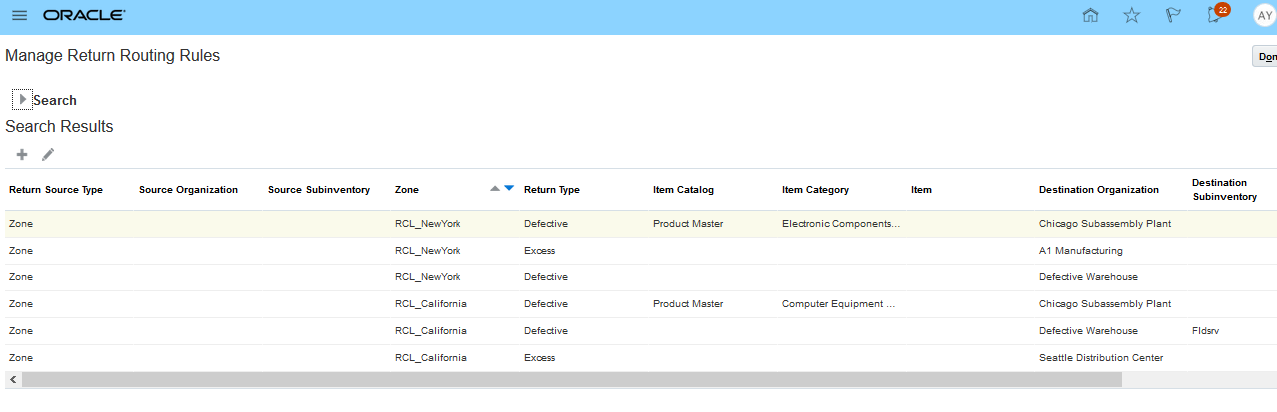 Source Type 'Zone' is used to define customer return routing rules whereas Source Type 'Organization and Subinventory' is used to define return routing rules for field stocking locations.