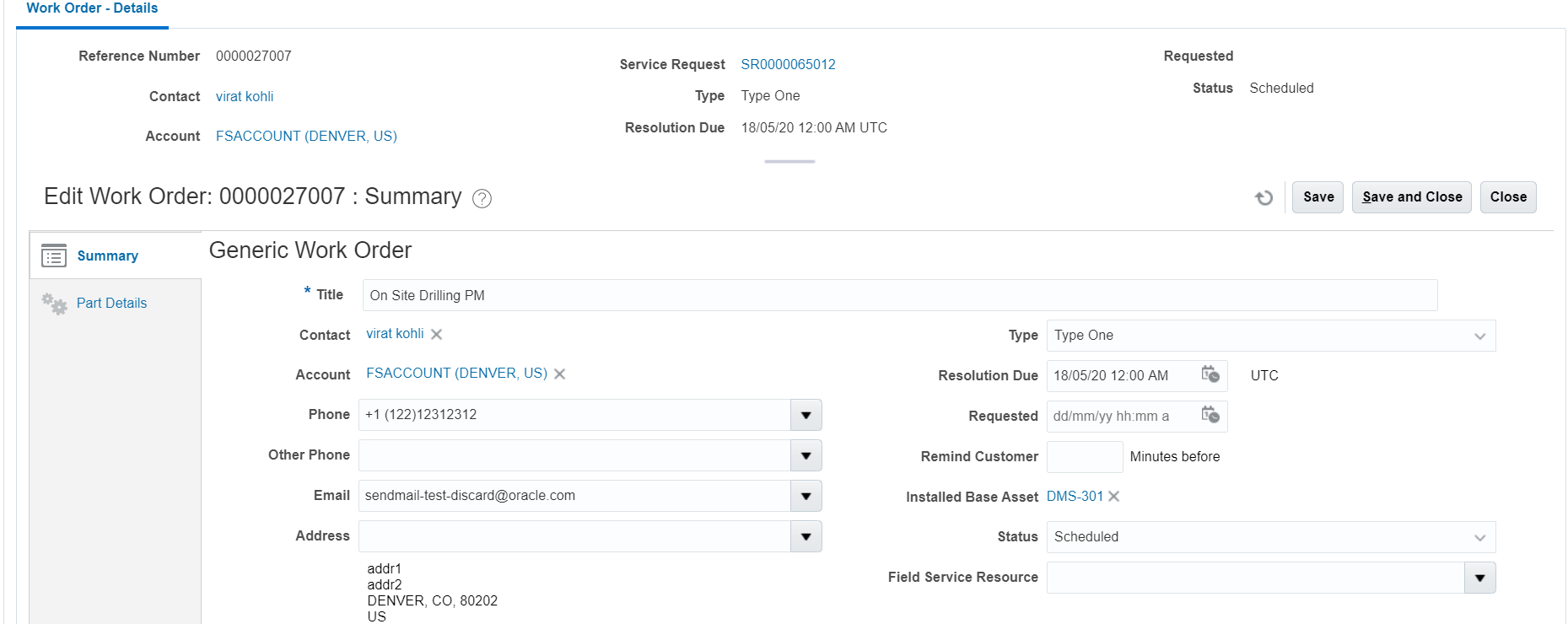 Service Request and Work Order Created in B2B Service for Preventive Maintenance Work Order
