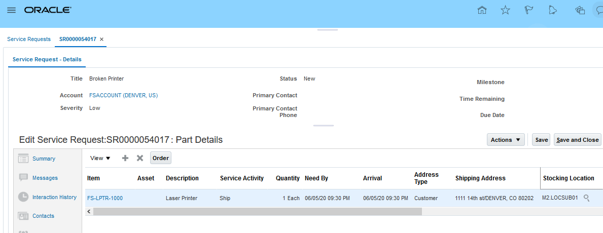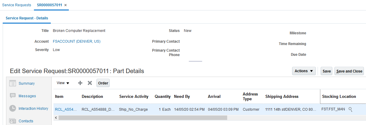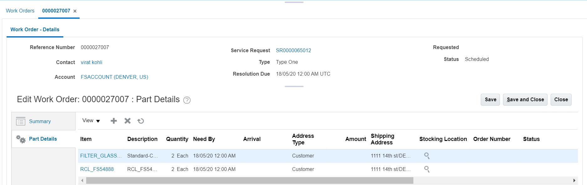 When the user clicks the Order button in the SR Parts Details tab, a Sales Order is created to ship the parts directly to the customer.