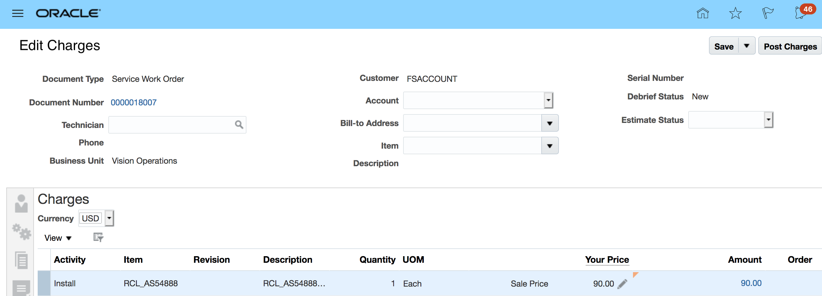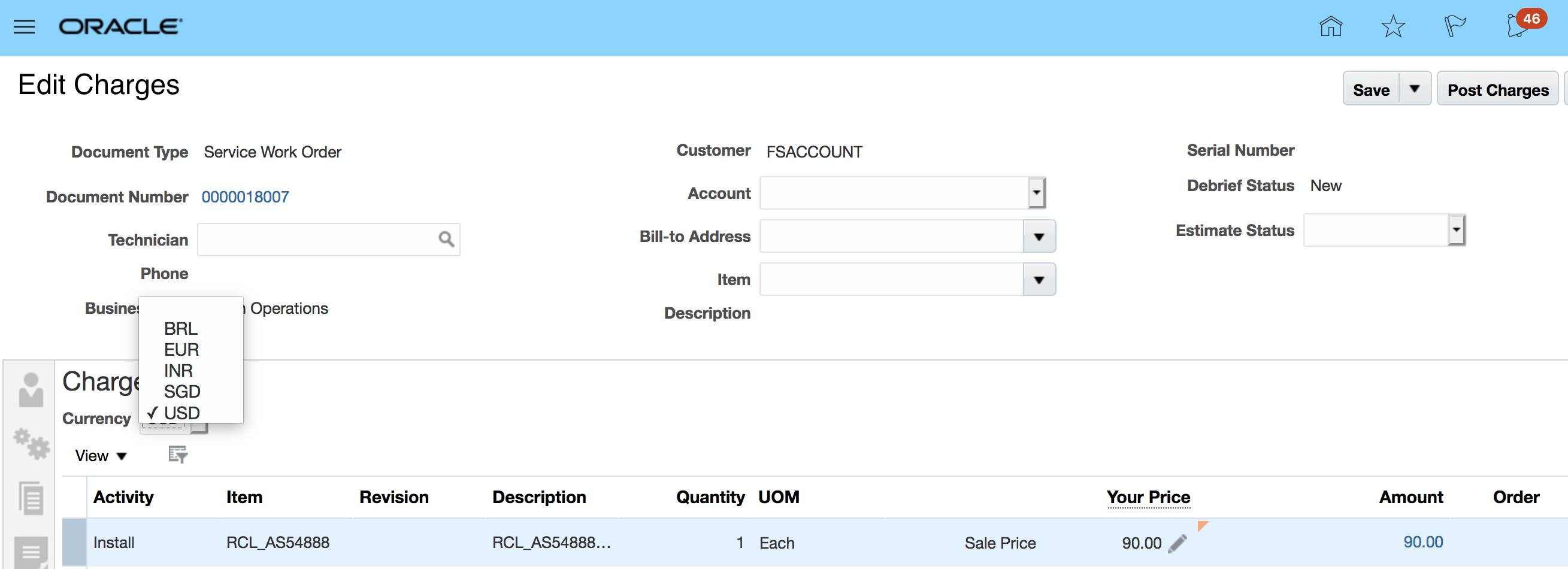 The Edit Charges page enables Field Service Administrators (FS Admins) to make adjustments, corrections, add or remove debrief transactions, and post them. FS Admins now have the ability to change the currency used to bill customers for services rendered using the Manage Charges and Estimates page. After you select a new currency, all existing charge lines will be repriced using the new currency exchange rate.