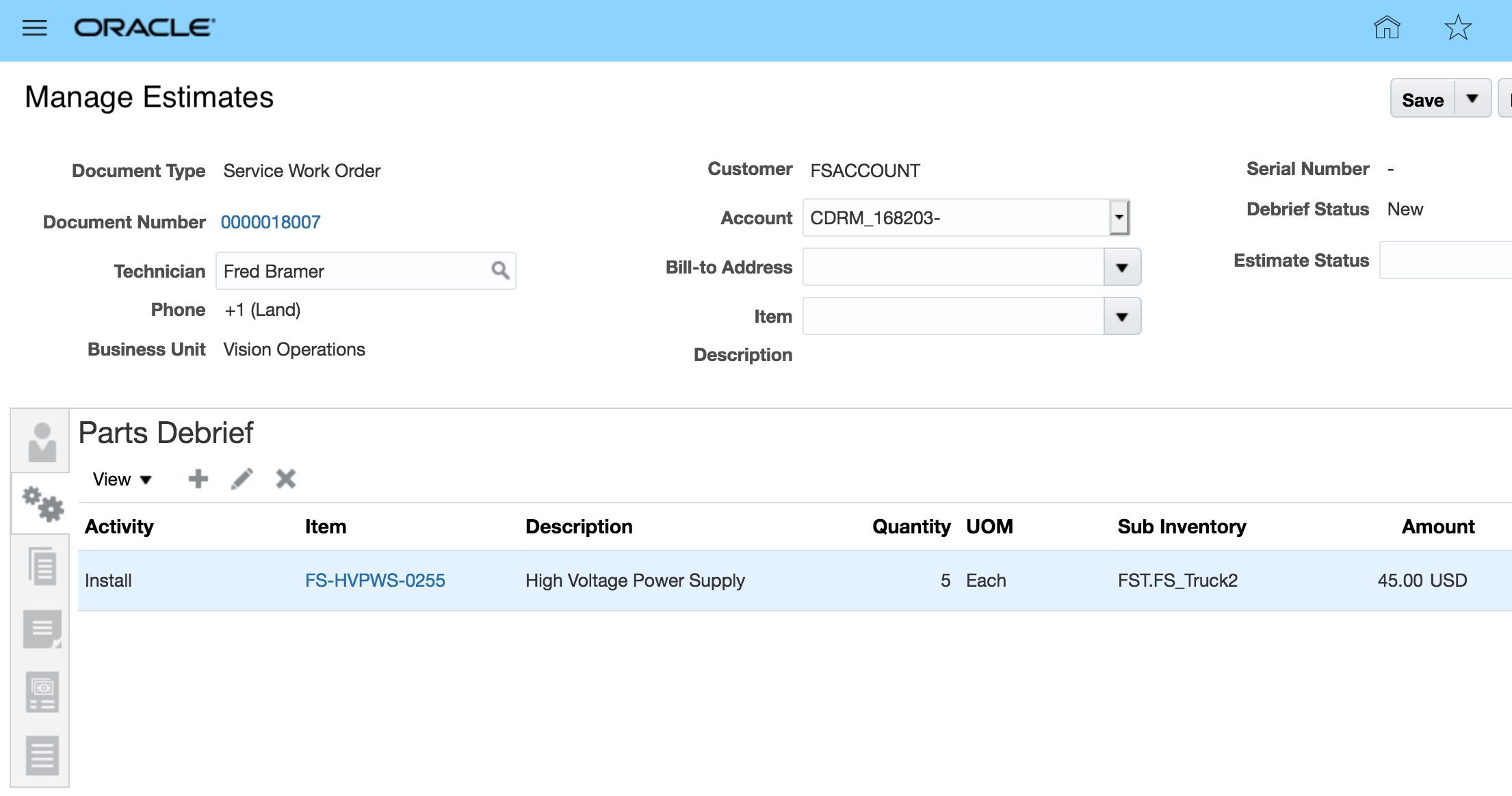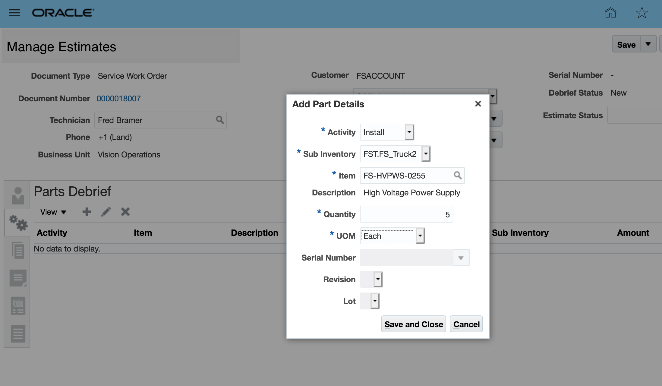 When a Debrief Line is created by a Field Service Administrator in the Manage Estimates UI or by a Field Service Tech in Field Service Cloud, a reservation is created so the parts in the technicians trunk stock subinventory no longer show as available. This reservation ensures that the part needed for this work will be available when required and not allocated to any other requirement. Service Logistics includes a REST service to create part requirements and with this new functionality the application will use an existing Inventory REST service to create reservations. When the debrief line is posted, the reservation is relieved. If the part requirement is modified or deleted, the reservation is also modified or deleted.