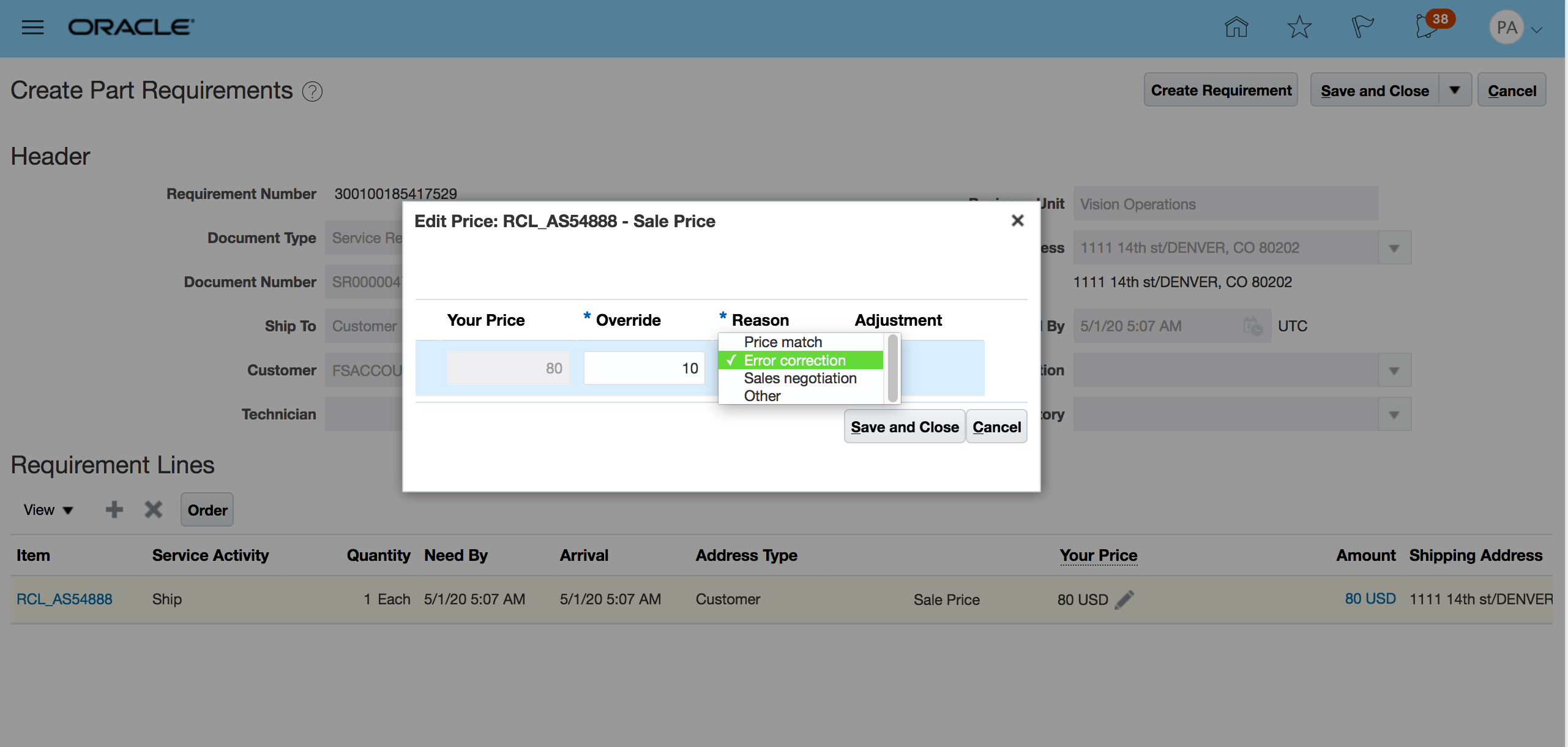 Clicking the pencil icon next to the Your Price value displays a pop-up window where you can make any adjustments, and also select a reason for the adjustment. After you enter the amount of the price adjustment, you must also select a reason for the adjustment. Seeded reason examples are Price match, Sales negotiation, Error correction or Other. You can add your own adjustment reasons in the lookup table. This functionality is also available in the Standalone Parts Requirement UI in Service Logistics.