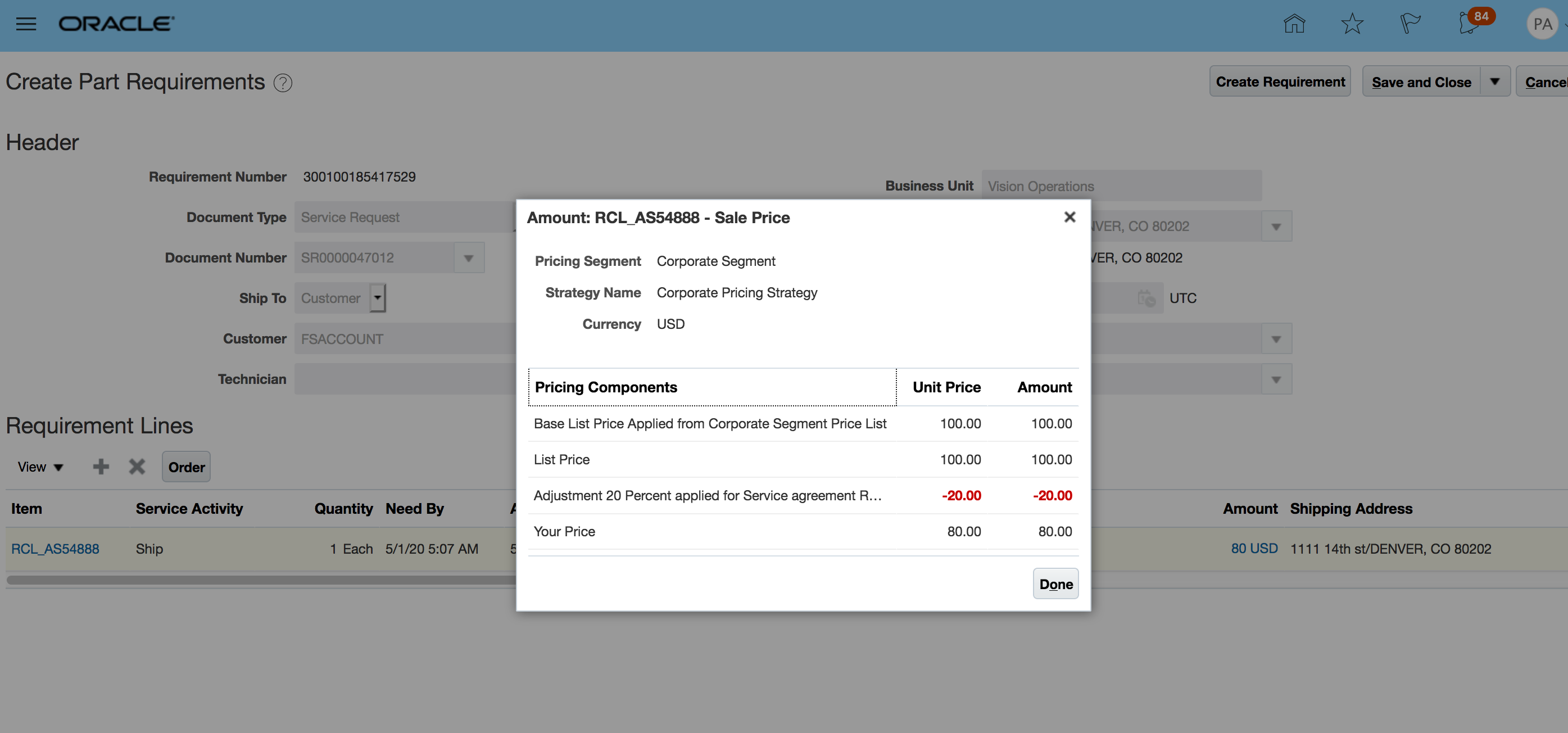 Using the Parts Detail tab of the Service Request UI, service agents can adjust the price of the parts required to resolve the service request. The price of a part is initially derived from a price list setup in Oracle Pricing Cloud. If there is a discrepancy between the price that the customer was promised and the price that was setup in Oracle Pricing Cloud, service agents can adjust the price to match the promised price. This feature enables agents to easily adjust the price of spare parts, which ensures that customers are properly billed for the parts used. After the part is priced, subscription adjustments are applied to get the final charge amount.