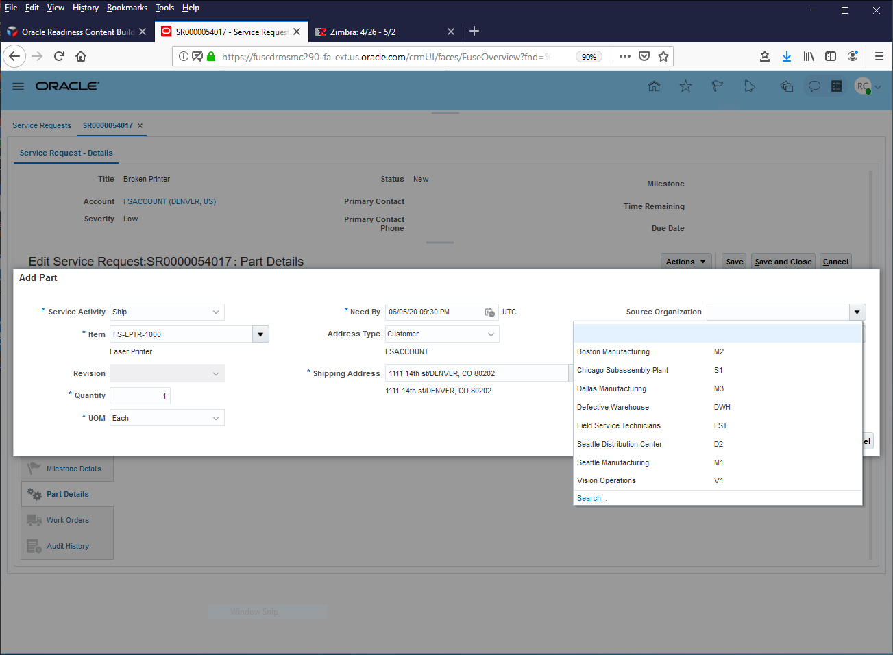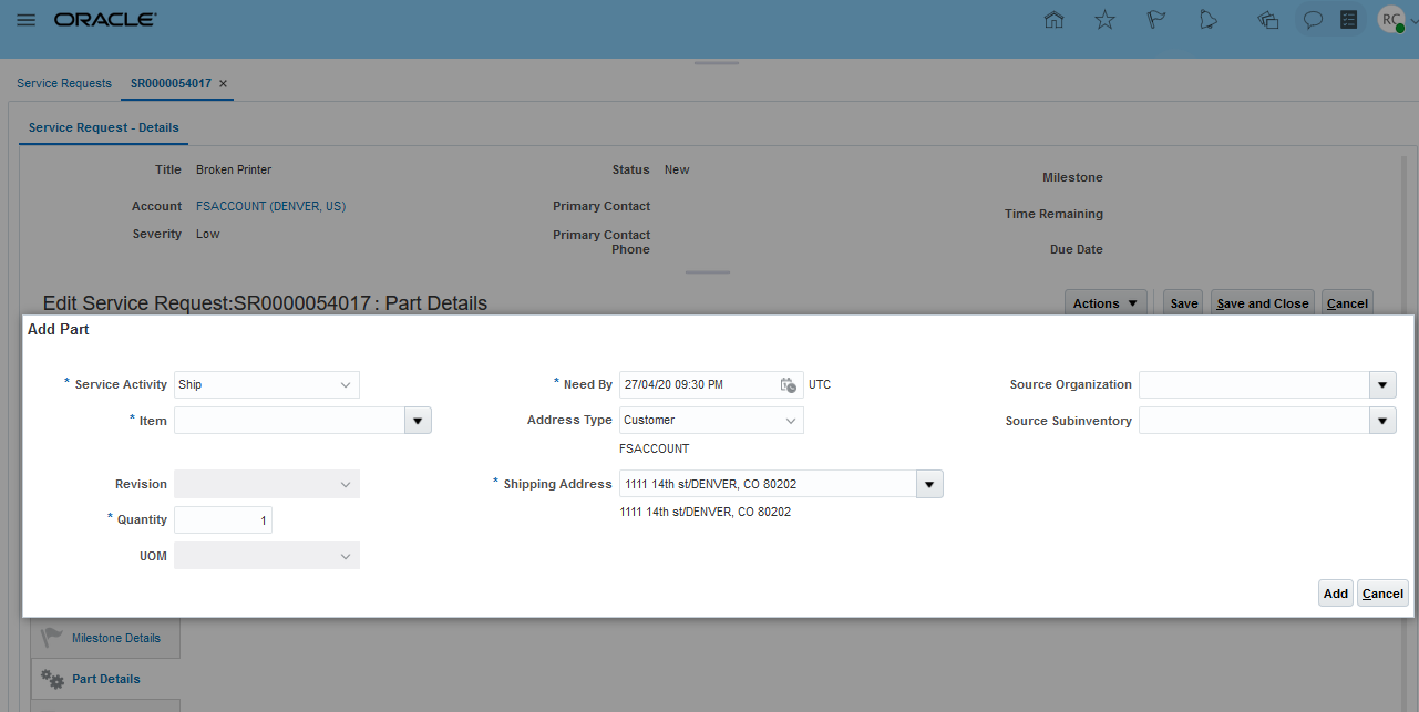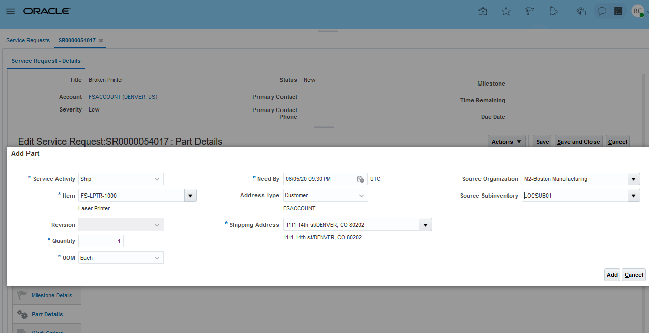 The Add Pars UI can be accessed from the B2B Service Parts tab, the Create Work Order page, the Work Order Parts tab, and from the Manage Part Requirements UI. This feature is especially relevant for our Depot Repair solution as depot repair shipments should be sourced from the repair center shipping dock not the parts supply chain. It will also better support field servcie organizations with simple parts supply chains that do not need the sophisticated sourcing provided by GOP and the new Parts Search program.