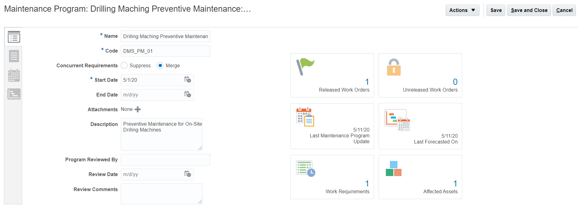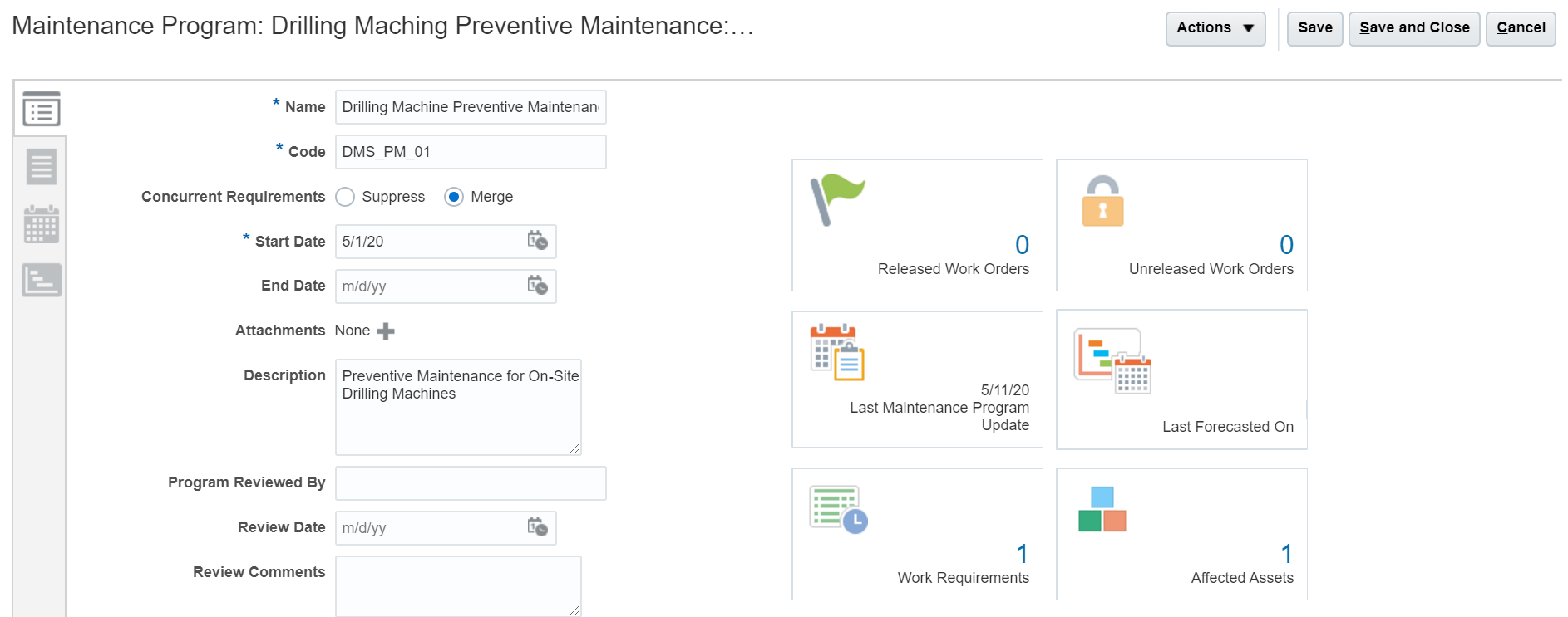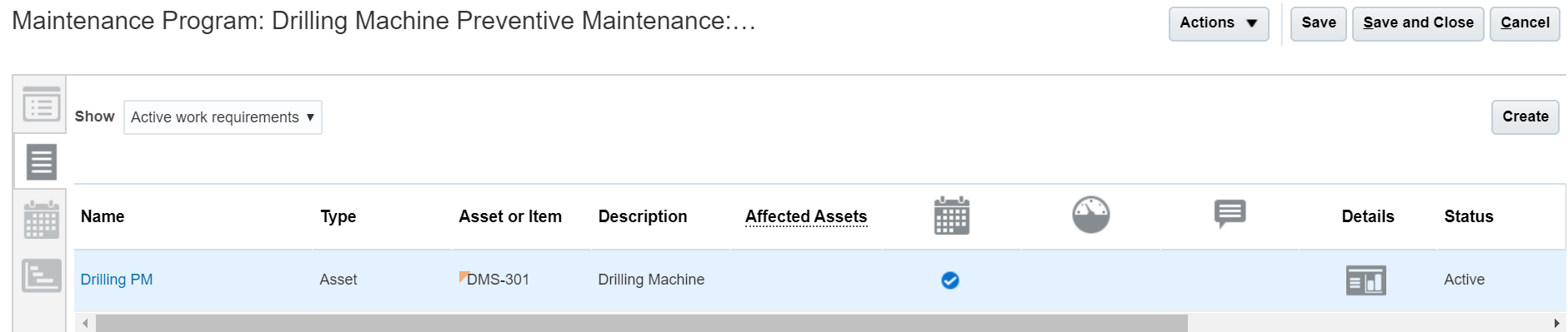 To perform periodic preventive maintenance, you need to define the maintenance program that is set up in Maintenance Cloud. You define the maintenance program for the asset or item with the following details:
