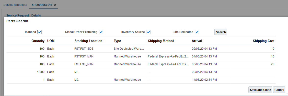 - Searches for parts in site dedicated, unmanned, and manned parts stocking locations (as set up in the Service Logistics Manage Stocking Location UI)