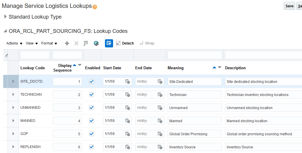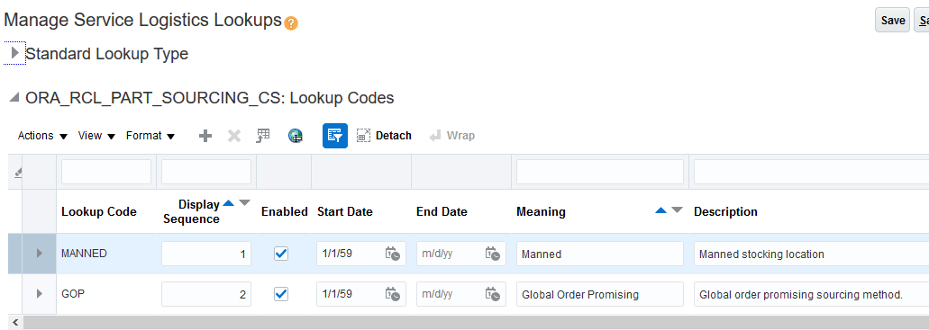You must configure the new Parts Search Program and UI by enabling the search methods you want to deploy in your business. You can set up which search methods are used for field service (service work orders) and customer service (service requests parts sales and exchanges) business processes. Manual sourcing is always enabled and is the only sourcing method enabled for Depot Repair logistics shipments. These setups are performed in the Manage Service Logistics Lookups UIs as displayed below. You can control which search methods are used in automated and interactive parts searches by selecting or clearing the Enabled check box. You can also control the search sequence used by automated sourcing by entering values in the Display Sequence fields. The lookup code REPLENISH is used to turn on the inventory replenishment search.