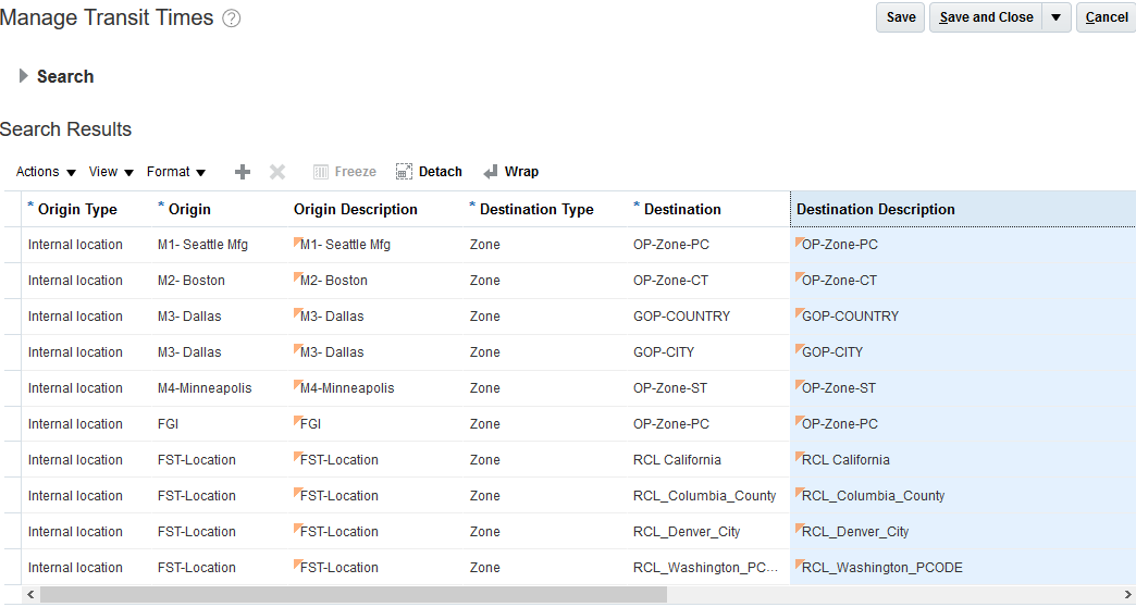 Setup transit times by mapping origin internal locations to destination zones along with the available ship methods and their transit times (Days) - Manage Transit Times UI