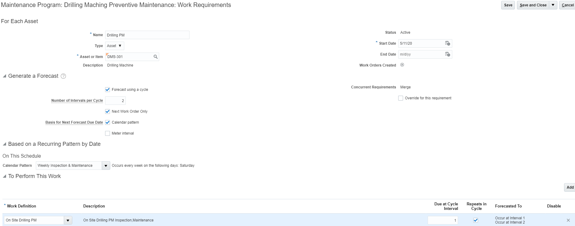 An example of the maintenance program including asset details, forecast criteria, and work definition association is shown below. This maintenance program is created for a specific asset.