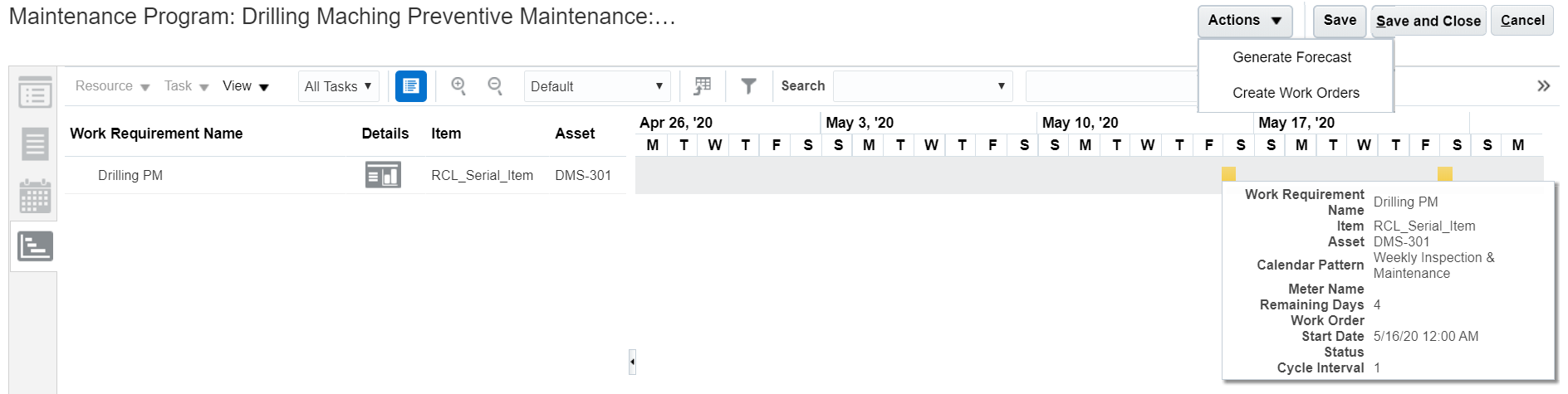 Instead of these actions from maintenance program page, scheduled processes can also be run for generating forecasts and creating work orders.