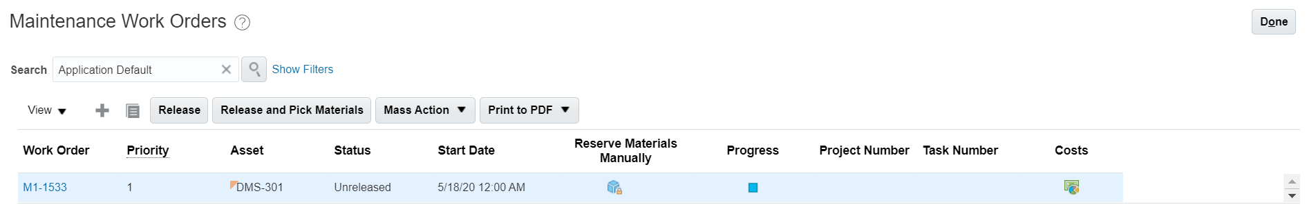 The work order status is updated to Released and the released work order count for maintenance program is indicated in the metrics,as shown below: