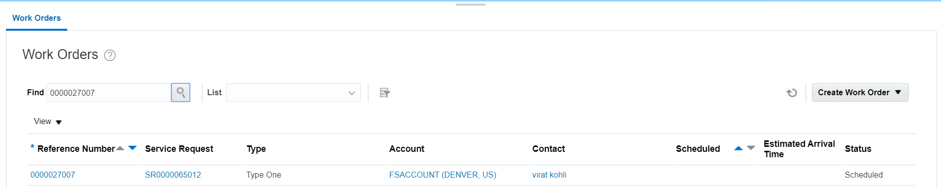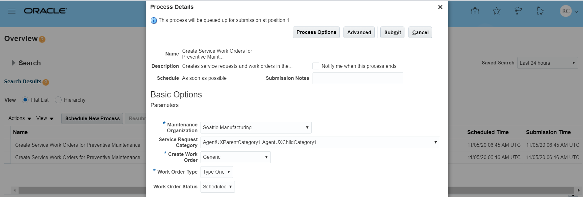 Run the scheduled process: Create Service Work Orders for Preventive Maintenance to convert the preventive maintenance work order details to B2B Service and create the service request and work order.