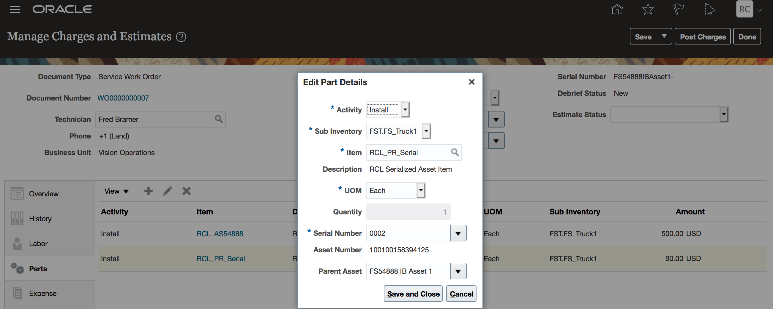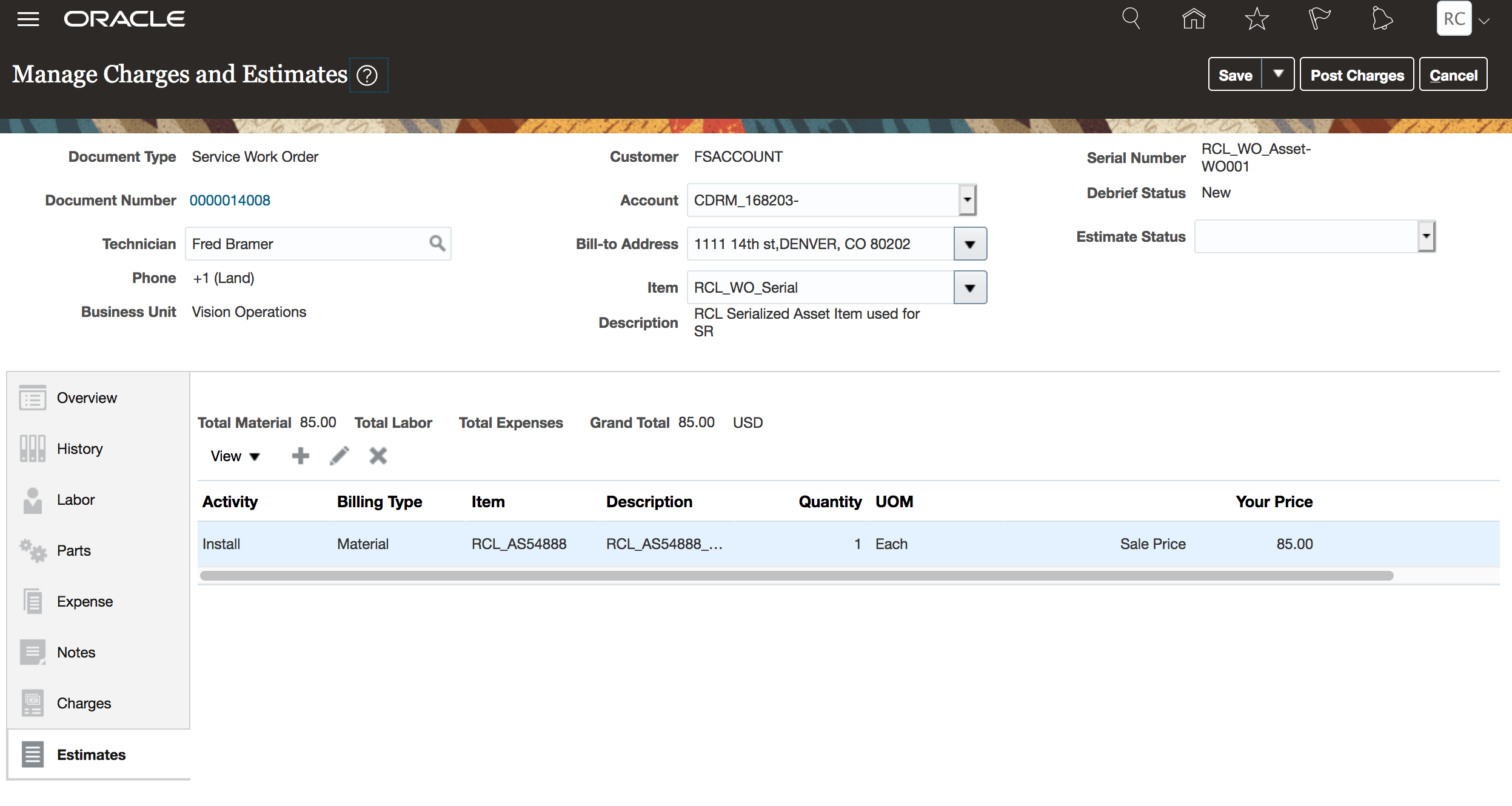 Easily Access Estimates, Service History and Asset Details in Manage Work Orders and Charges UI